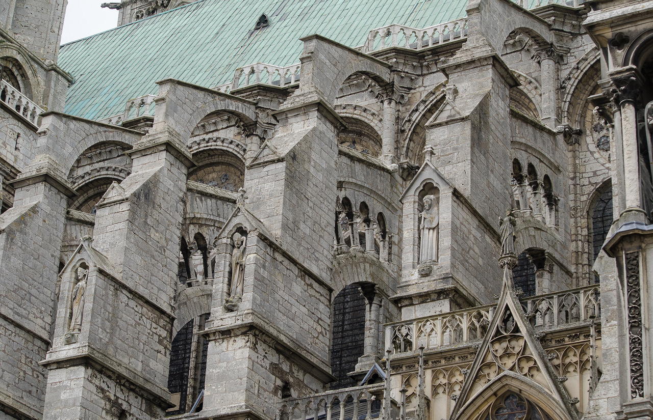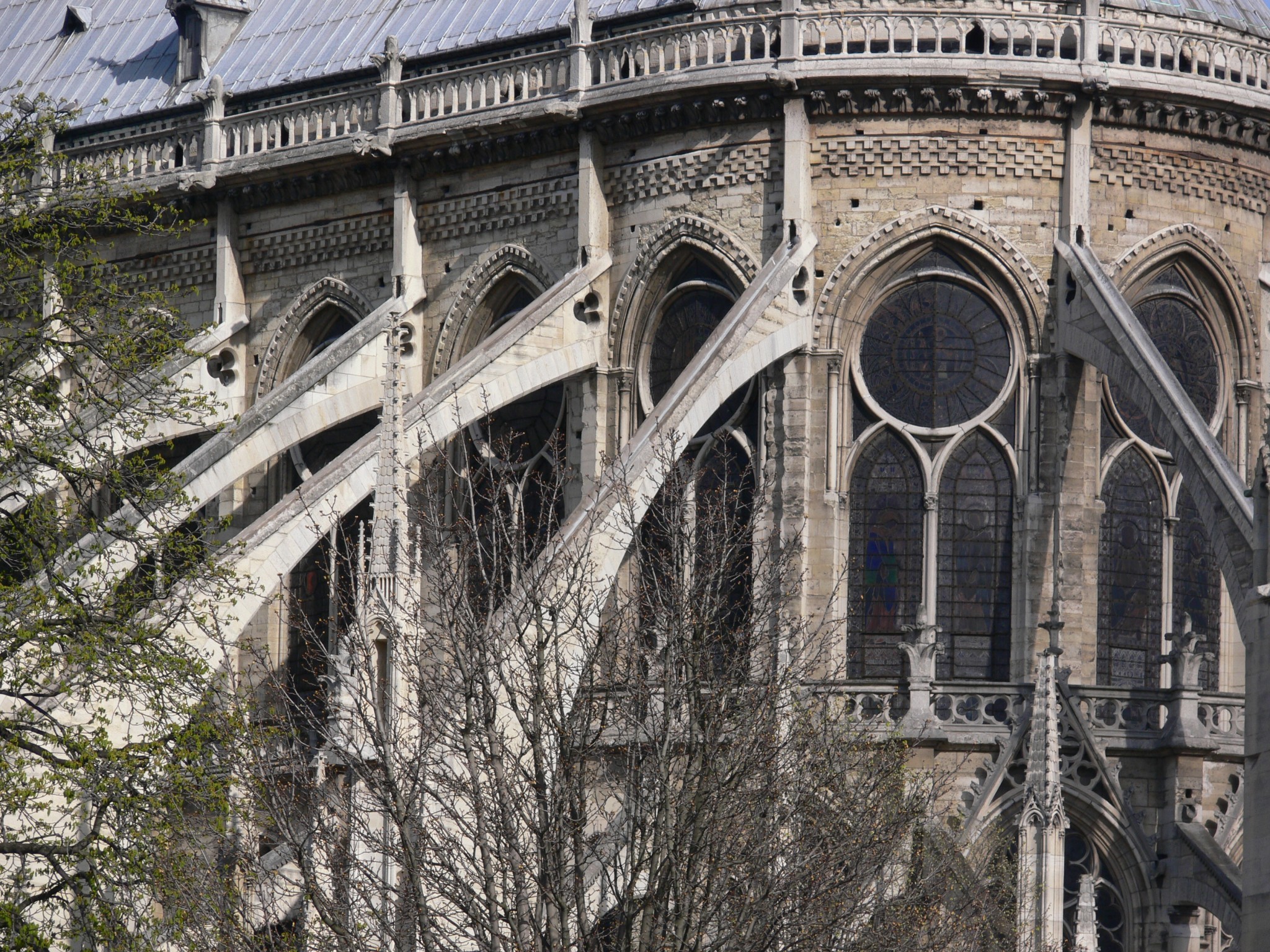 Аркбутан. Очень, очень важная штука! Мы о ней уже писали. Это наружная подпорка, смахивающая на конечность краба. Такая полуарка, упирающаяся в стену, выглядит эффектно, но немного зловеще. Аркбутаны – самый типичный признак готического собора, хотя в рудиментарном виде применялись еще римлянами. Они могли упираться на опоры, уходящие в фундамент, а могли возлежать поверх контрфорсов. Аркбутаны обычно пристраивали с восточной стороны. Они решеткой окружали апсиду и деамбулаторий, так как именно эта часть собора обычно была самой светлой и легкой. Здесь устанавливались огромные окна, площадь каменных стен была минимальной, поэтому необходима была поддержка извне. Восточная часть собора была непарадной, в отличие от западного фасада: у Нотр-Дам де Пари, к примеру, она выходит на реку. Поэтому и на старых гравюрах охотнее изображали западный фасад с парадными порталами.