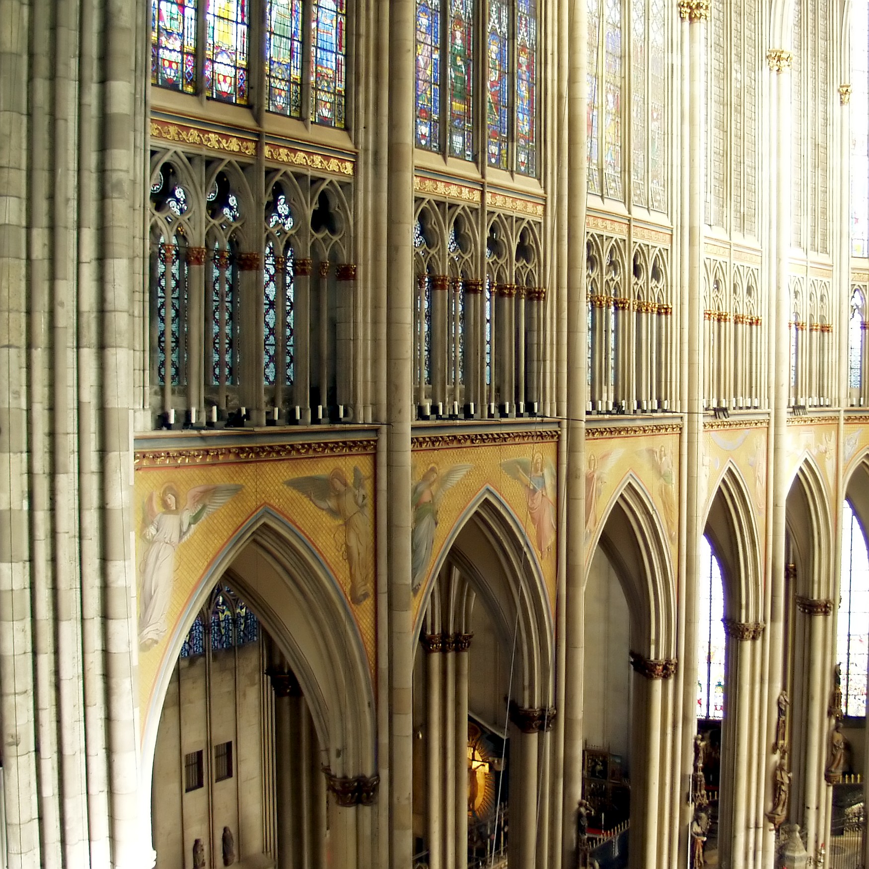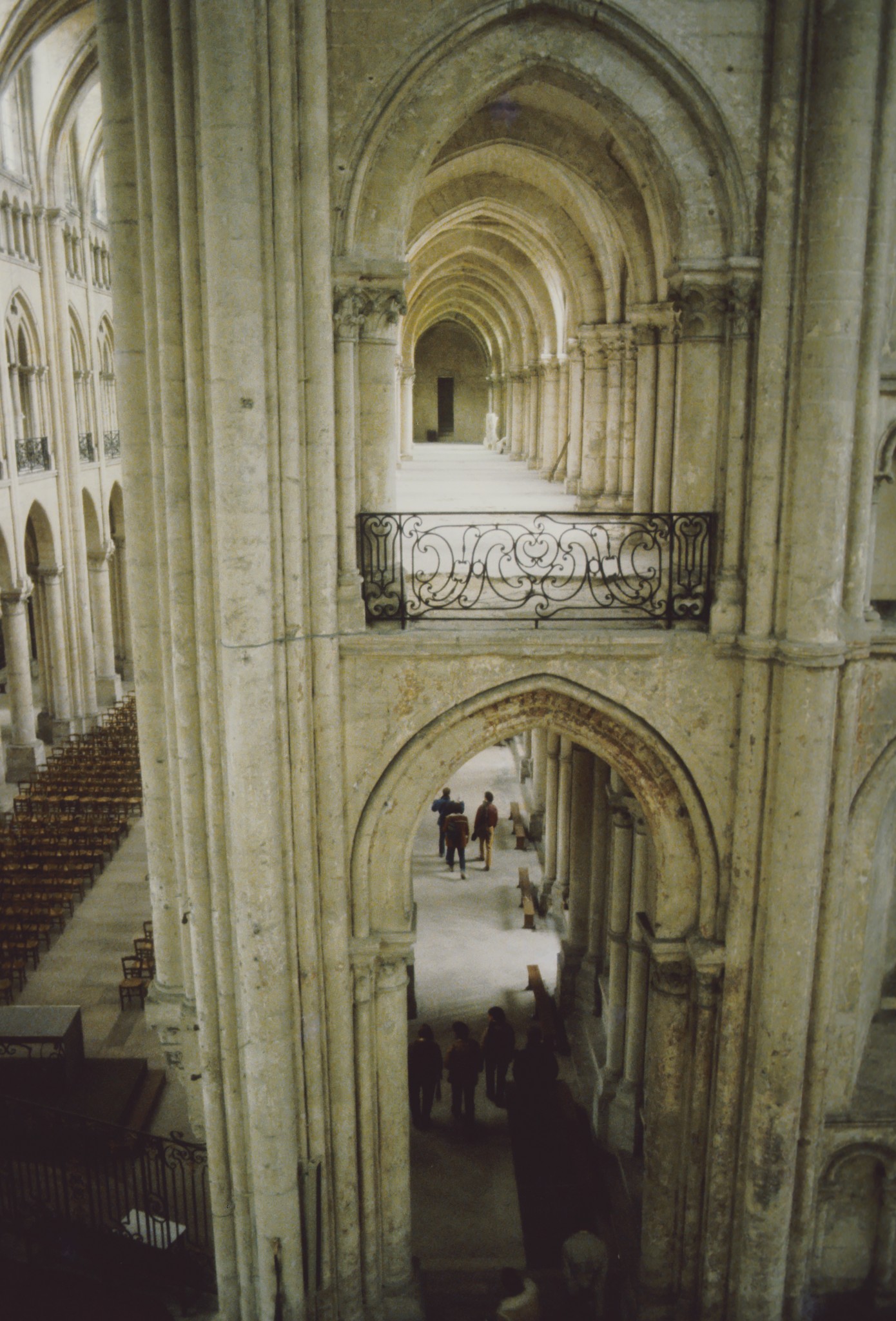 Трифорий. Это такая узкая галерейка, украшенная аркадой. Она проходила в толще перегородки, отделявшей главный неф от боковых. Нередко представляла собой ряд тройных аркад, откуда и название. Проход мог быть настоящим, по трифорию могли гулять священники (или горбатые звонари), но частенько его делали ложным, декоративным.