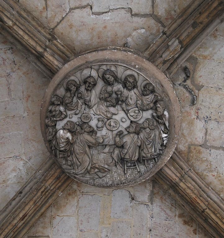 Замковый камень. Ударение на втором слоге, а не на первом. Это важная деталь стрельчатой арки, а затем и нервюрного свода. Именно в замковый камень упираются ребра свода, он берет на себя всю нагрузку. Поначалу он был просто камнем, не особо эстетичным, но затем его стали украшать и оформлять в виде цветов, розеток, всяких свисающих штуковин и т.п., так что со временем замковый камень стал довольно эффектной штучкой.