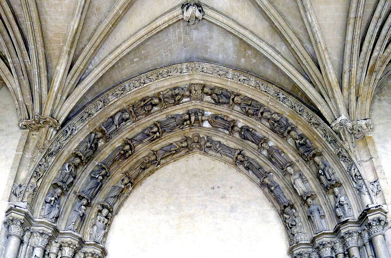 Тимпан. Когда квадратные двери вписывали в полуциркульную арку портала, возникал вопрос – что делать с полукруглым кокошником над дверями? Пустым оставлять негоже, его стали украшать фигурами. Как известно, готика не любит полукружий, над такими тимпанами стали устанавливать радуги архивольтов, а еще выше – вимперги. Или чуть по-другому, зависело от фантазии зодчего.