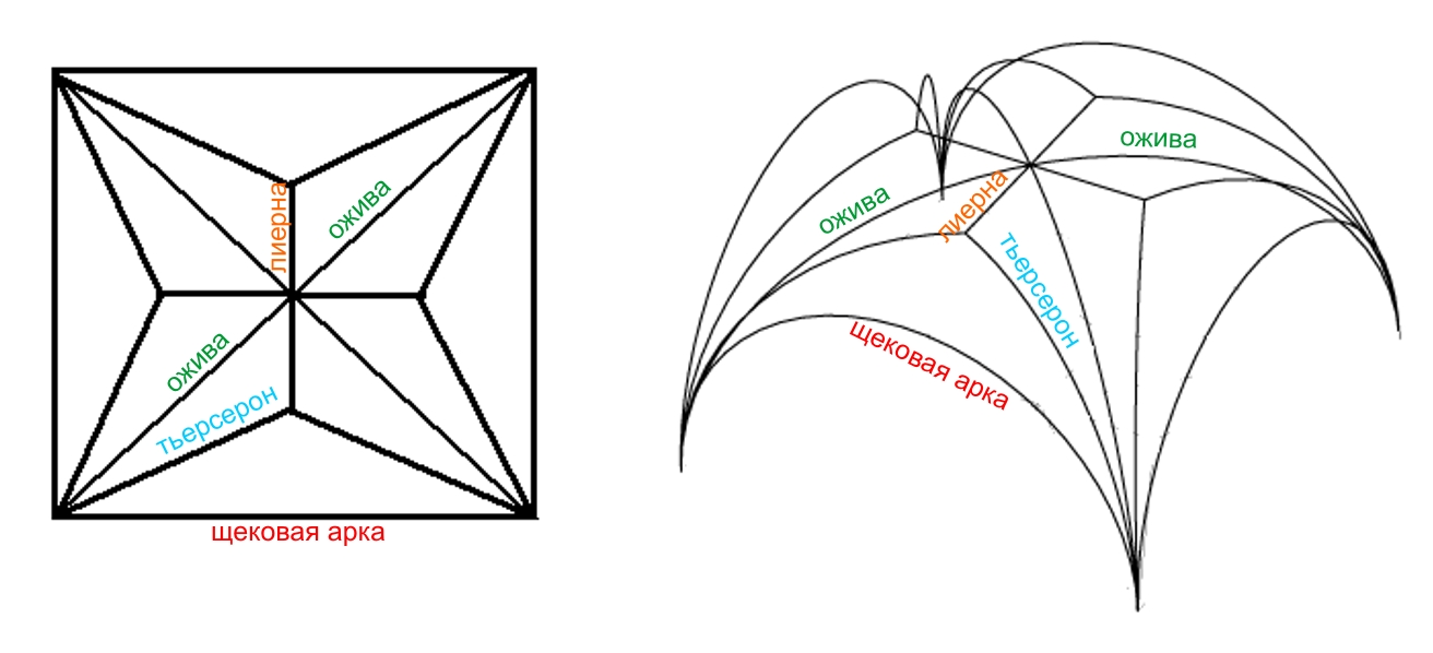 Тьерсерон. А также ожива, лиерна и щековидная арка. Это совсем уж высший пилотаж, но вдруг вам пригодится – блеснете в офицерском собрании. Речь идет о названии разных типов нервюр в системе крестово-нервюрного свода.