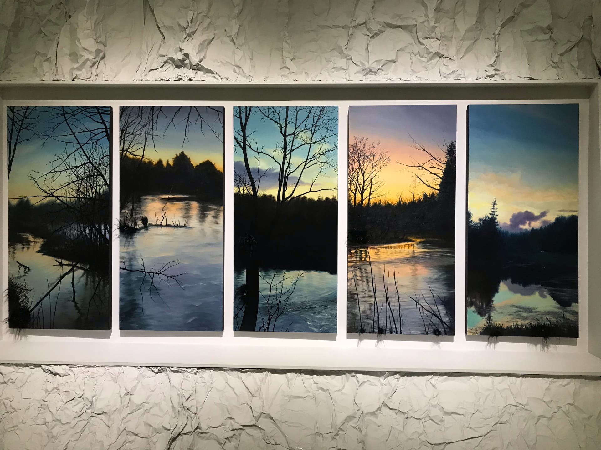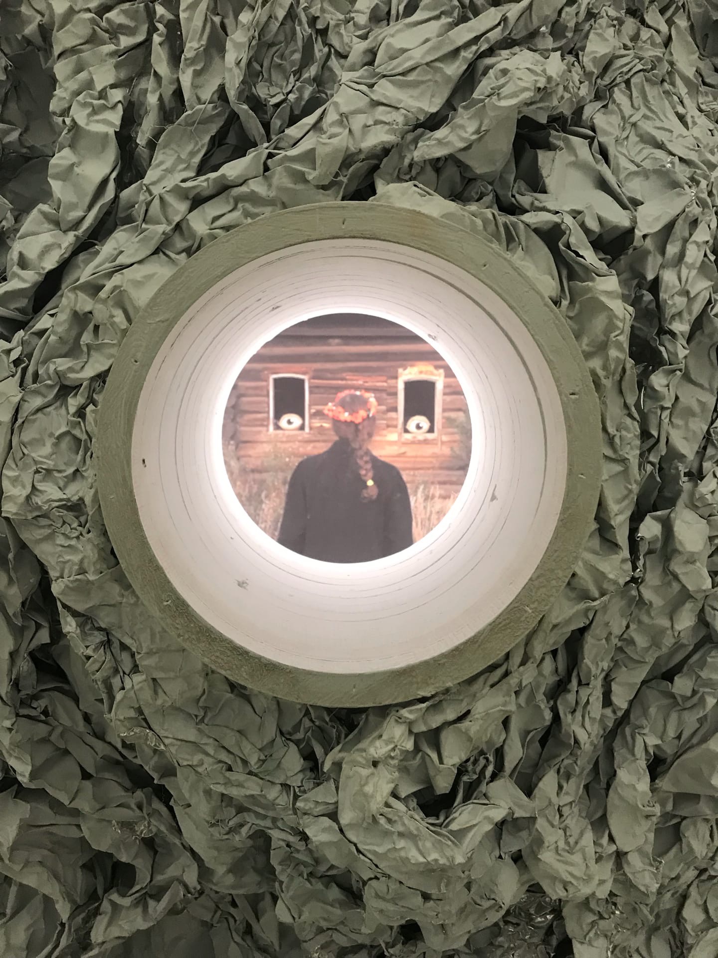 С самого начала выставка старается погрузить посетителей в особую атмосферу. Казалось, только вы сложили рюкзак в ячейку и по просьбе охранника надели маску, поднялись на третий этаж, как из реального мира вас вырывают парящие под потолком марлевые гуси-лебеди. Их огромные причудливые тени покрывают почти весь широкий холл, и по едва пробивающемуся свету приборов создается впечатление, как будто стая птиц загораживает собою солнце. На выставку посетители входят через толстые деревянные двери, чуть ли не до потолка ростом, подобные воротам в русские терема. Из трех прямоугольных проемов между ставнями сразу же открывается вид на известную со школьных учебников картину «Витязь на распутье».