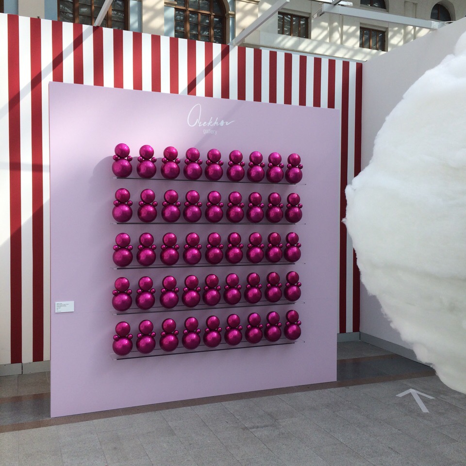 В этом году стенд Orekhov Gallery оформлен в розовом цвете. В пресс-релизе галереи значится, что яркий цвет символизирует счастье. Однако с посетителями стенда Орехов делится, что у него уже есть золотая и серебряная скульптуры «Агата», но его дочка очень просила сделать розовую.