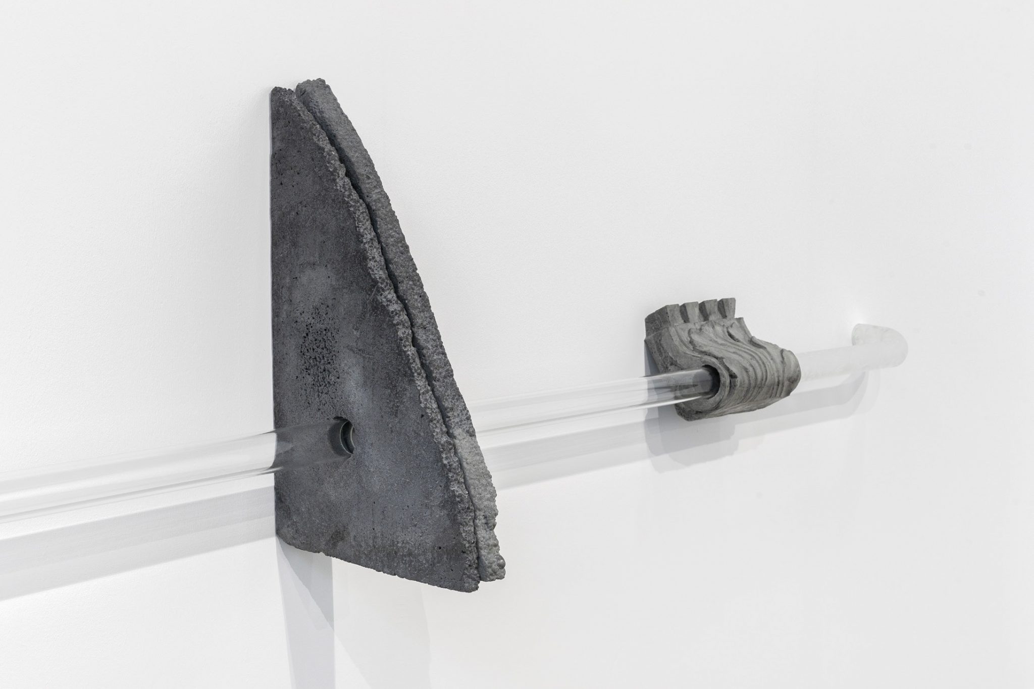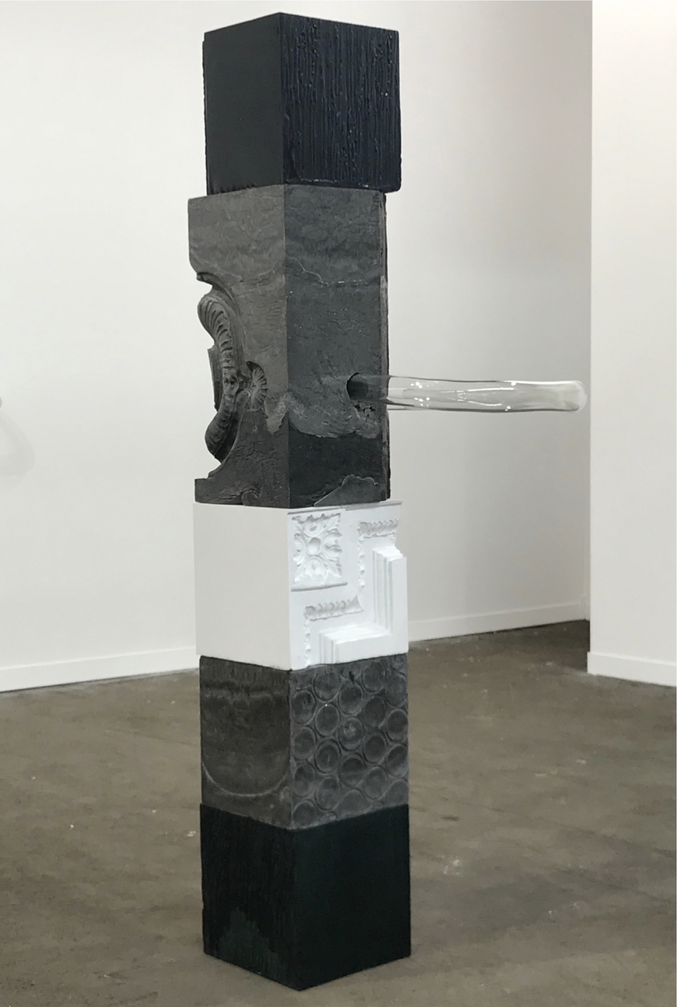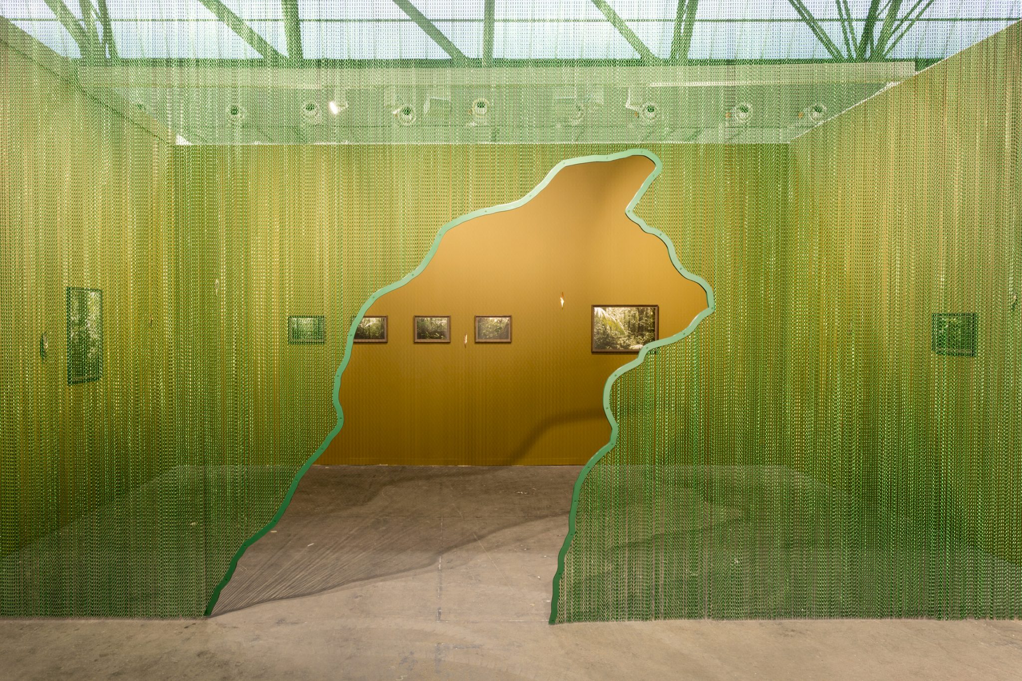 Переместимся в секцию PRIME. Здесь, за зеленой металлической шторкой, напоминающей непроглядные кроны деревьев или же стену дождя в тропических лесах Южной Америки, расположилась инсталляция Даниэля Стигмана Мангране, представленного галереей Mendes Wood DM. В своих работах каталонский художник ставит вопрос о границах между природой и искусством. Размещая скульптурные работы, полученные из природных материалов, вместе с фотографическими работами, изображающими сочную растительность тропического леса, художник стирает различие между органическими и геометрическими формами, витальным и абстрактным, предлагая нам взглянуть на мир с точки зрения единства и гармонии, отбросив бинарное разделение.