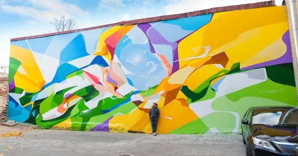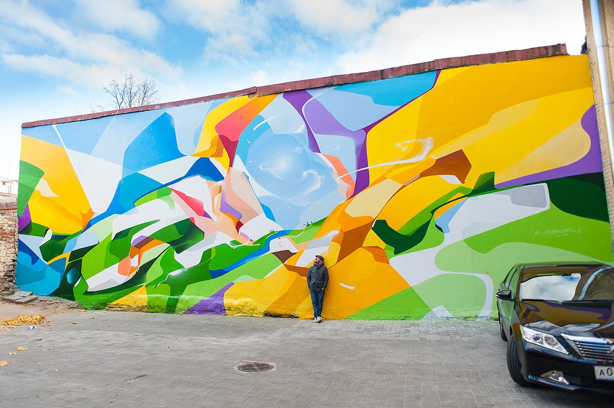 Если вы хоть раз видели работы художника по прозвищу Zmogk, теперь вы наверняка узнаете их из десятка других: таким неповторимым стилем отличаются они. Кажется, что плавные изгибы нашли общий язык со строгими геометрическими формами, а узнаваемые образы решили поиграть в прятки за ширмой из красочного калейдоскопа.