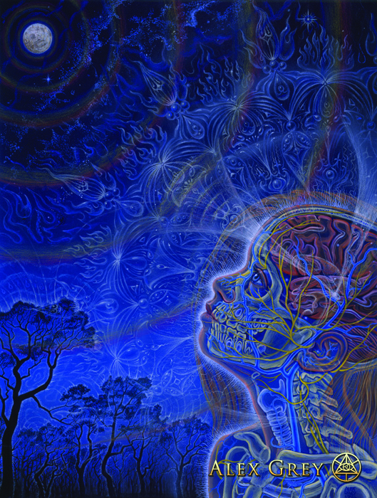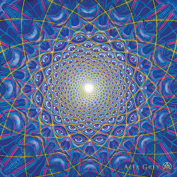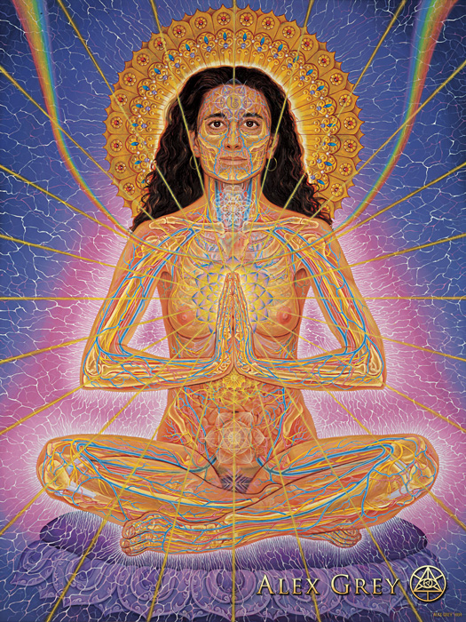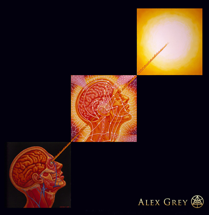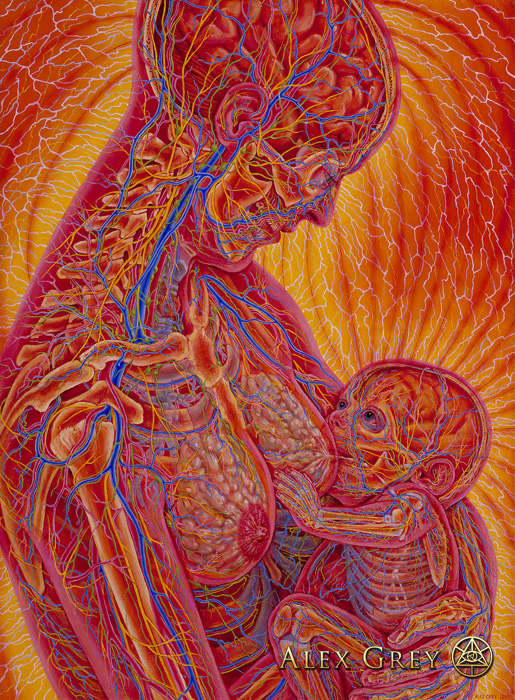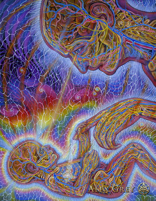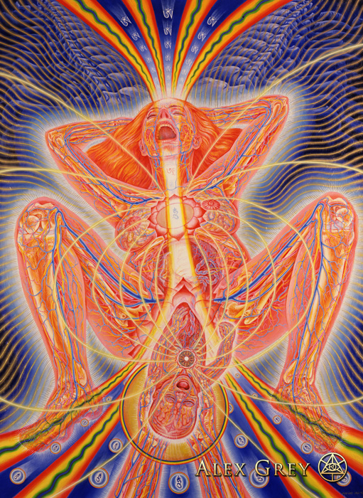 Американец Алекс Грей (Alex Grey) решил объединить эти два подхода в своих работах и стал художником, изображающим человека так, как он есть – с кровеносной и лимфатической системами, костями, мышцами и сухожилиями. Но он добавил к этому биологическому описанию свет ауры, тайну третьего глаза и еще несколько щепоток мистики и эзотерики. Ради этого Грей не только стал учиться духовным практикам, но и… пять лет проработал в морге, готовя трупы к вскрытию.