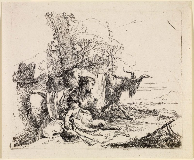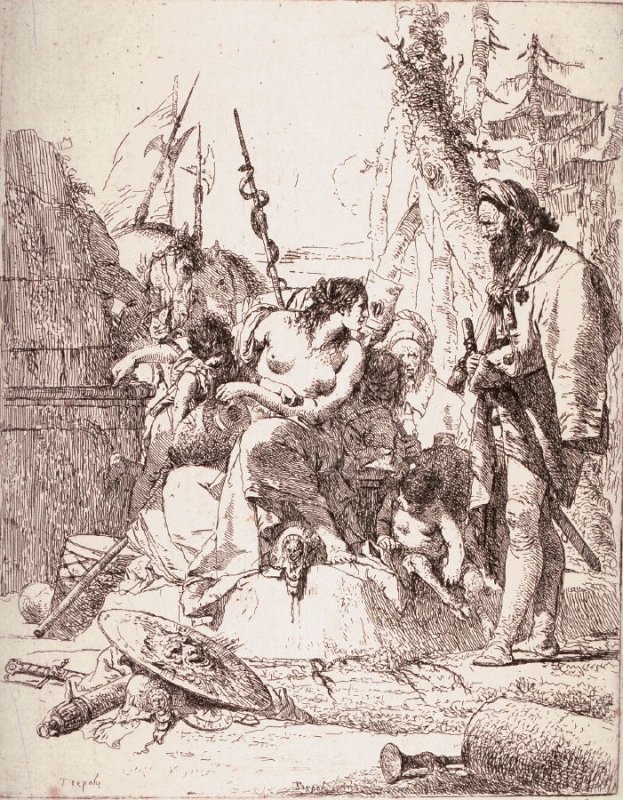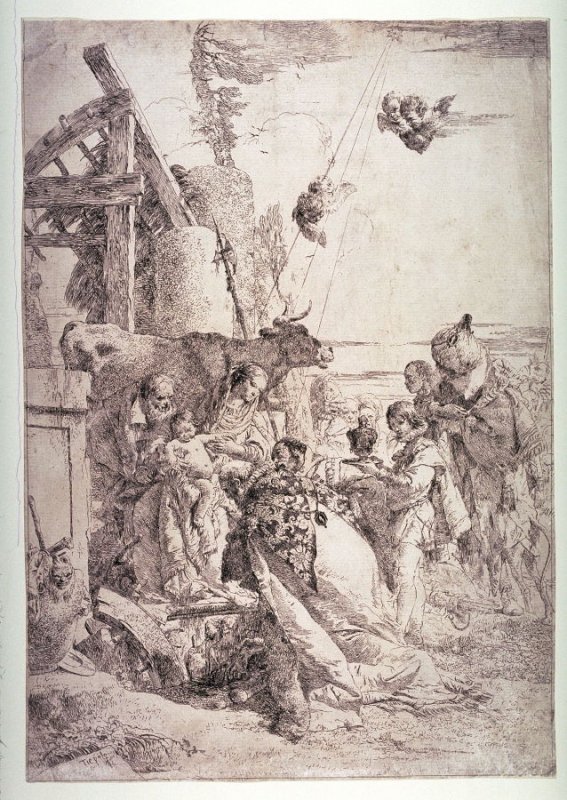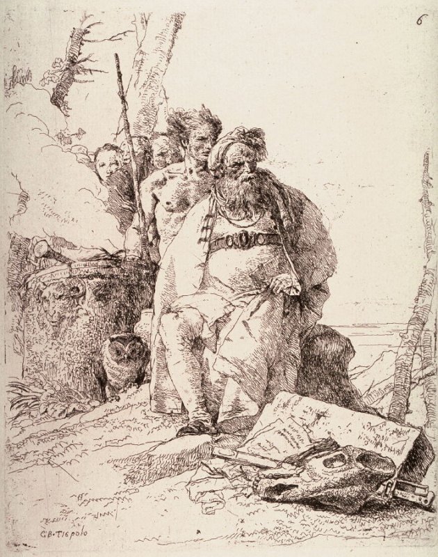 Рисунки Тьеполо выделяются по тому же принципу, что и большие полотна - они наполнены светом и воздухом, создается ощущение тонкой игры цвета и полутонов, хотя это лишь карандаш, уголь и тушь. Офорты Тьеполо также пользовались заслуженным вниманием. Особенно известны два цикла: "Вари Каприччи" (всяческие причуды) и "Скерци ди фантазия" (шутки фантазии).