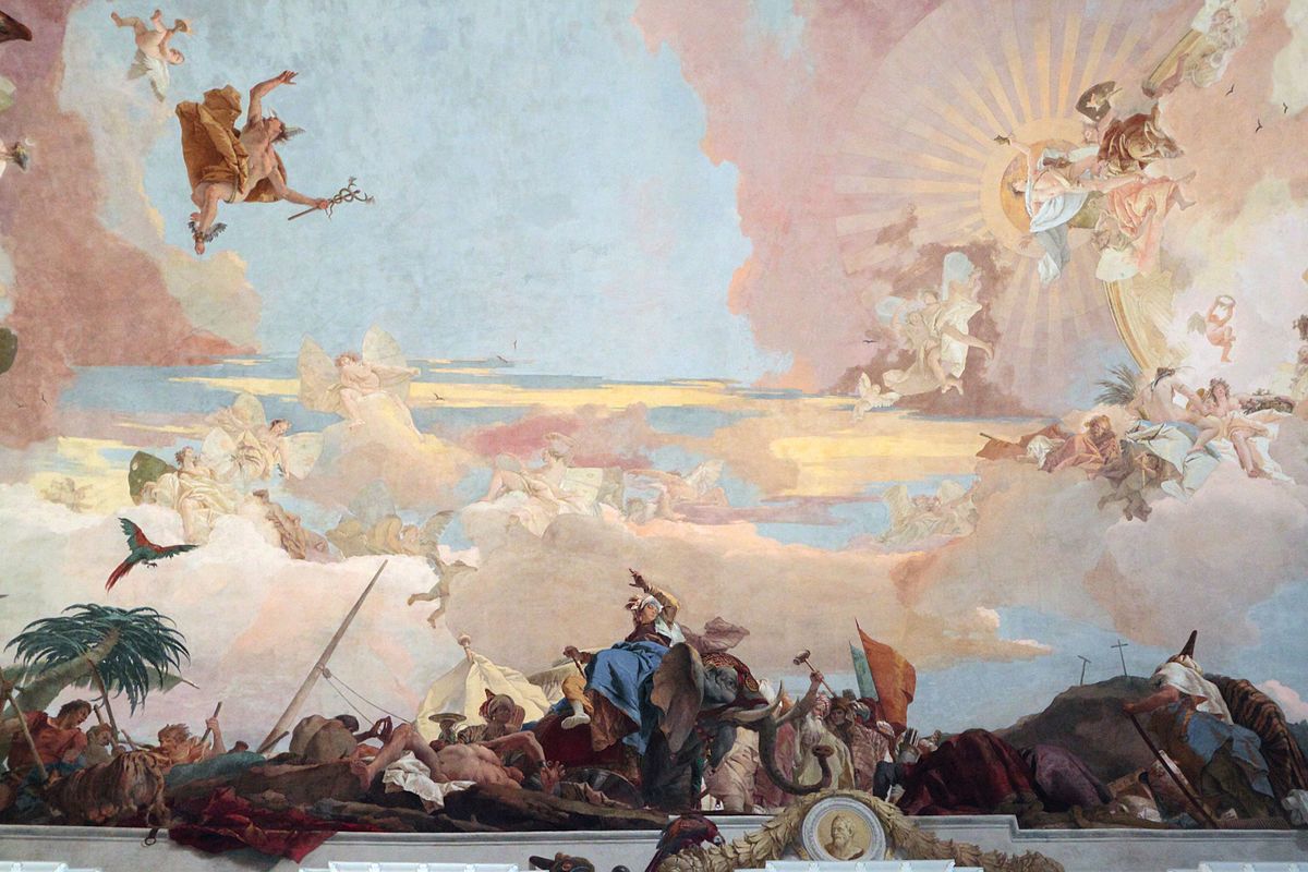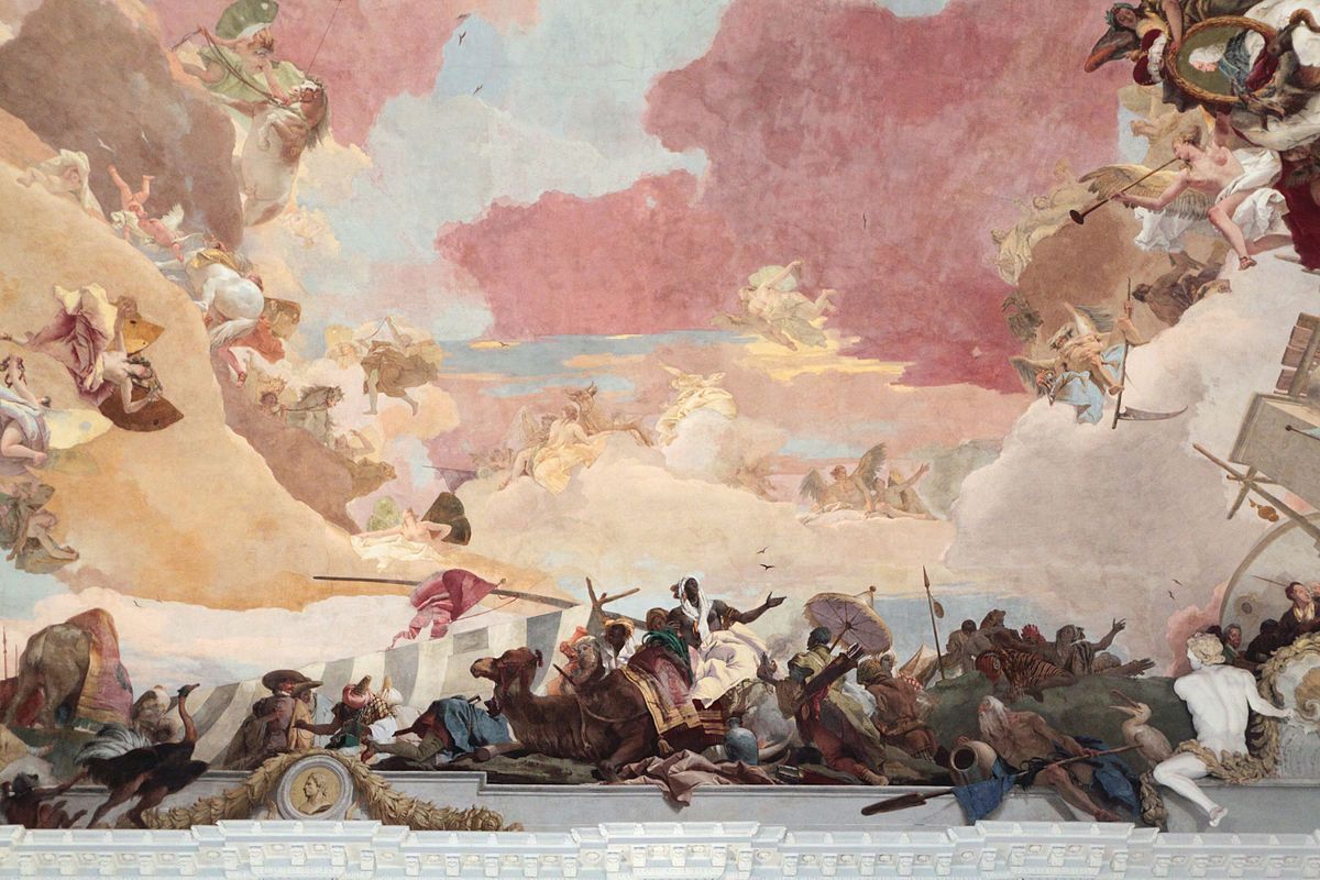 Рассмотрим, к примеру, его фрески во дворце князей-епископов, Вюрцбургской резиденции. Тьеполо пришло приглашение от франконского епископа Грейфенклау. Соблазненный гонораром и масштабом проекта, он тут же отправился в переход через Альпы на Юг Германии, в федеральные земли Баварии, в город Вюрцбург.
