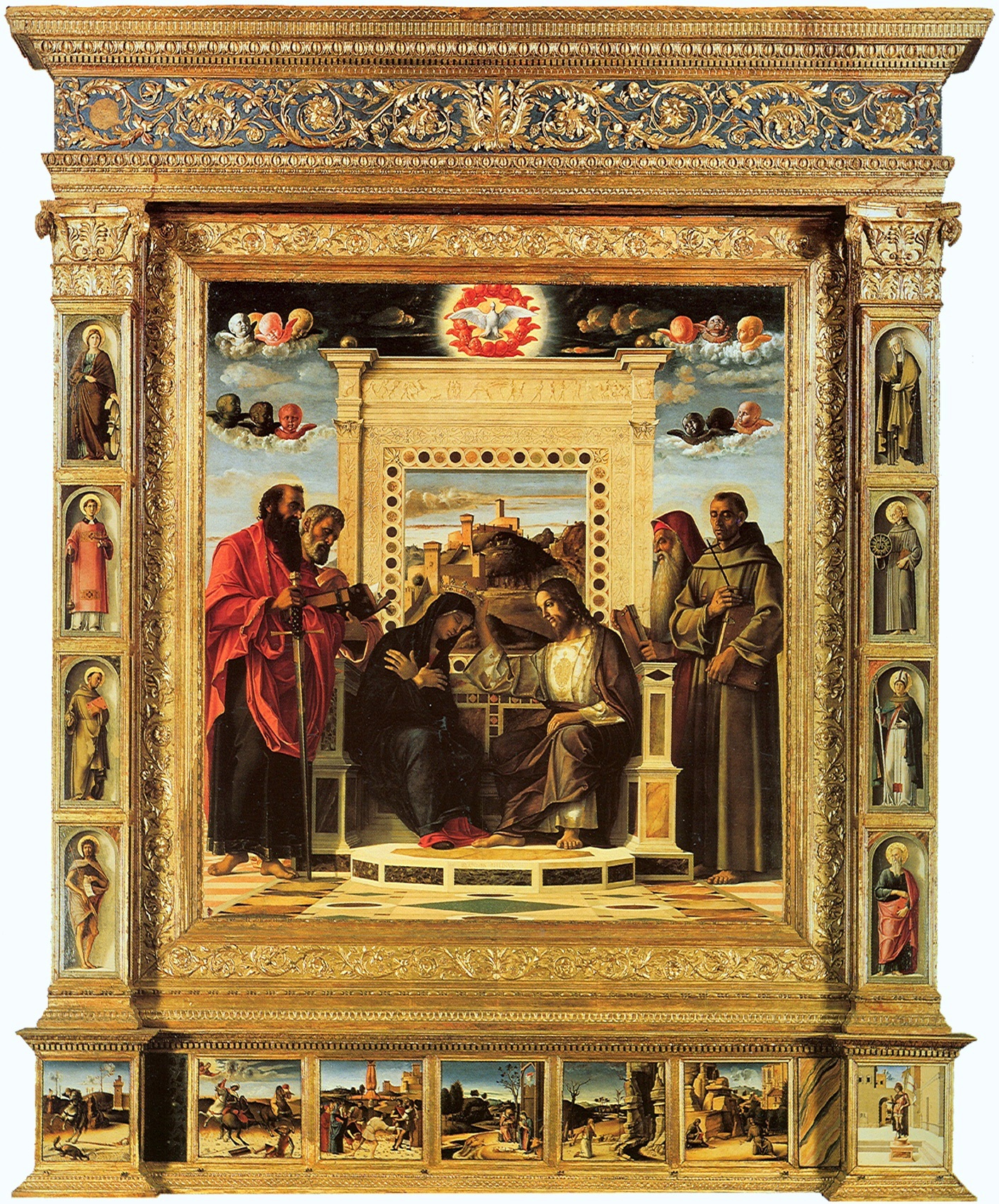 Центральной картиной Алтаря Пезаро является монументальная работа кисти Беллини «Коронование Марии». Вокруг нее до сих пор не утихают споры, ведь точно не установлено, когда именно была написана эта картина. Разные исследователи относят ее создание к 1465-70, 1470-75 годам и даже к 1480 году.