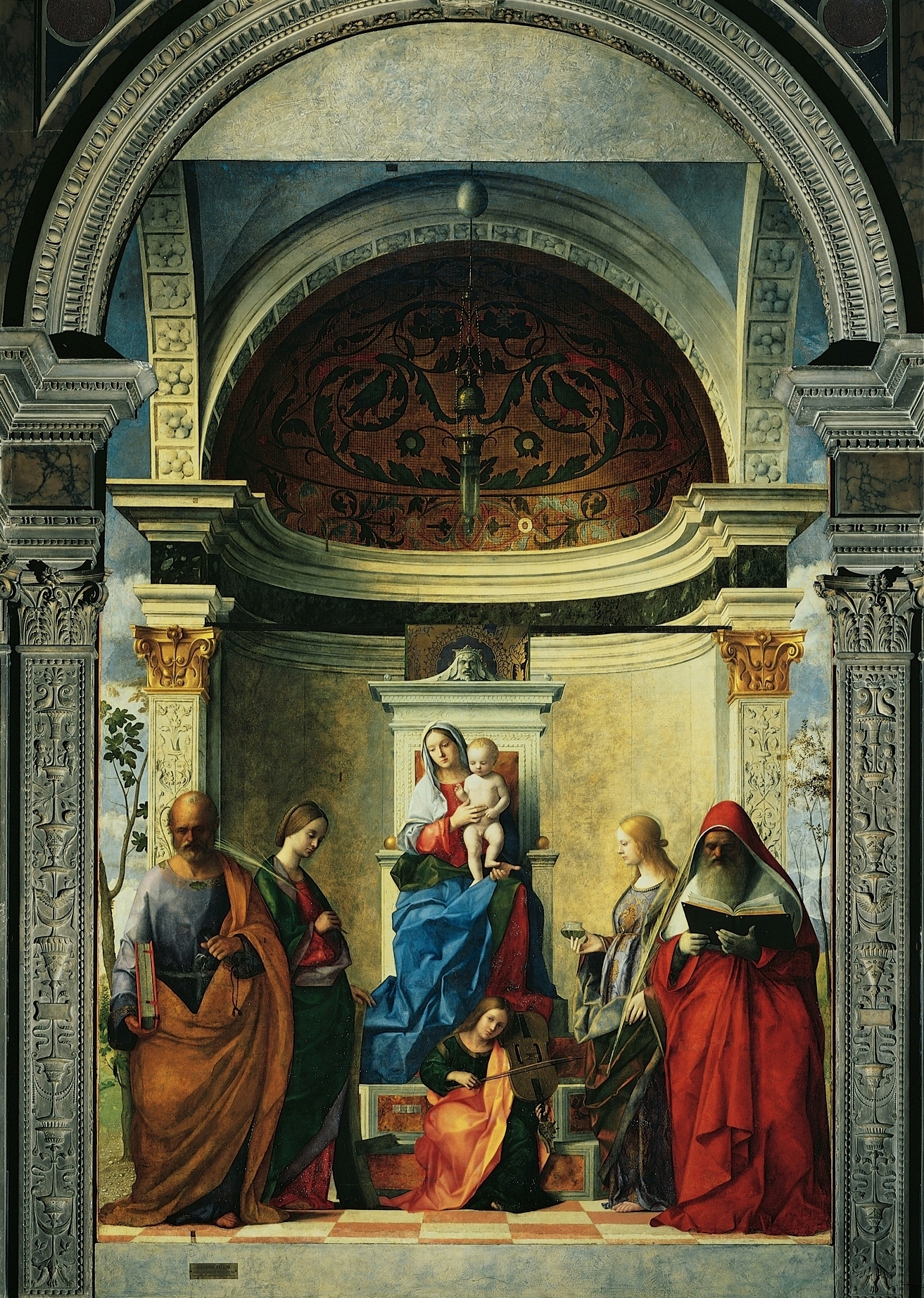 Одни ученые полагли, что сюжет изображения был заимствован из средневековой поэмы о скитаниях души. Поэтому картина носит второе негласное название – «Души Чистилища». Но другие исследователи интерпретируют полотно иначе. По их мнению, женщина в центре картины олицетворяет собой Венецию, чей покой оберегает апостол Павел, острый меч которого символизирует правосудие. А коронация Святых Себастиана и Иова при свидетельстве Марии представлены здесь как триумф Венеции или ее основание в день Благовещения.