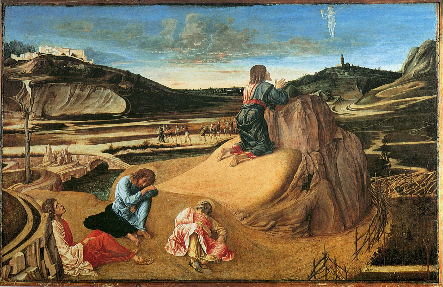 Но живописец не стал полностью следовать художественным предпочтениям своего друга. Поэтому пейзаж, изображенный Джованни, значительно отличается от того, каким его рисовал Мантенья: в нем на смену каменистым местностям и пустыням приходят зеленые поля и прозрачная водная гладь. Неизменным остается только пристрастие Беллини к библейским сюжетам и образам.