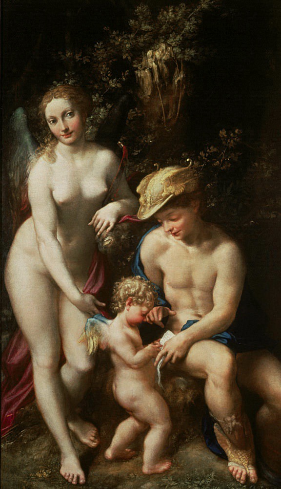 Написанная в 1528 году по заказу герцогини Изабеллы д`Эсте, она должна была воплощать противоборство добродетели и жажды наслаждений, представленных, в свою очередь, фигурами Меркурия и Венеры. То, что на картине изображено лишь три лица, позволяет подробно рассмотреть задумку. Композиция выдержана, но позы отличаются живостью, уже здесь художник пробует играть с перспективой, немного укорачивая правую руку Амура. Откровенная игривая поза Венеры контрастирует с деликатно прикрытой тенями наготой, особо тщательно выписаны руки и выражения лиц. Родись Корреджо в наше время, его назвали бы перфекционистом. Он был строг к себе и скрупулезно работал над мелочами.