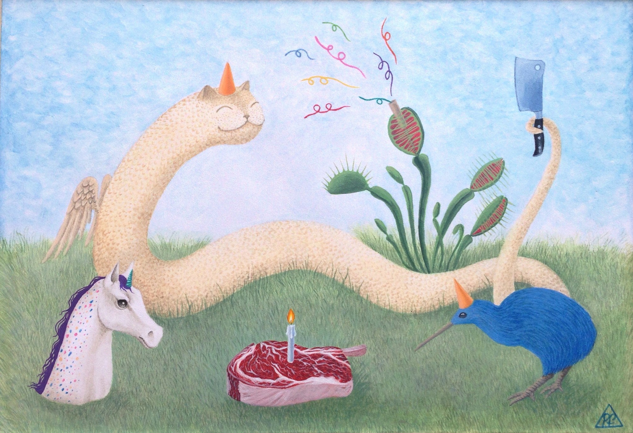 Это была моя первая персональная выставка. Галерея Дома художника «Лес» предоставила два помещения: для экспозиции и для зоны кейтеринга. Для создания сюрреалистической атмосферы в качестве декораций использовались увеличенные персонажи моих картин. А на кривом зеркале было написано: Surrealism choose u («Сюрреализм выбирает тебя»). На выставке были представлены 23 работы. Идея состояла в том, чтобы высвободить подсознание зрителей, убедить их совершить визуальный побег из реальности в мир моих снов. Выставка длилась целый месяц и превзошла все мои ожидания. Она прошла на достаточно высоком уровне для художника из провинциального города. Плохо помню открытие выставки, все прошло как в тумане, но я очень благодарна всем, кто занимался организацией, помогал и пришел поддержать! Иногда возникали трудности, с которыми мы успешно справлялись, но в целом было очень круто. Я услышала много добрых слов, ощутила прилив вдохновения и приобрела ценный опыт для будущих выставок.