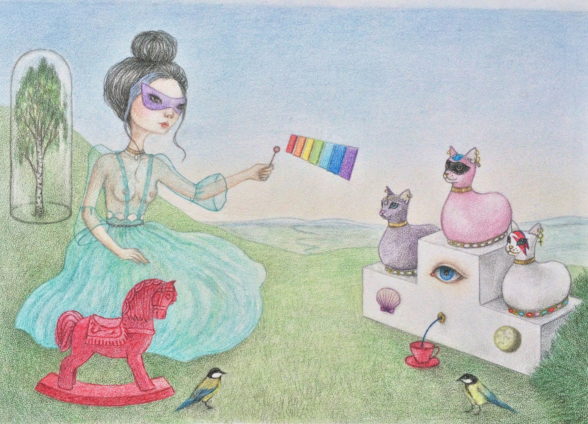 Все начинается с образа, который, чаще всего, приходит ко мне во сне. Это может быть персонаж, композиция или даже цветовая гамма. Иногда меня вдохновляет какой-то определенный человек, животное или событие. Тогда я стараюсь сразу зафиксировать это на бумаге. Я не делаю четко проработанных эскизов, главное — это определиться с композицией. Если картина будет большого формата, могу сделать более детальный набросок. Но чаще всего зарисовки выглядят как примитивные скетчи, раскрашенные цветными карандашами. Я никогда точно не знаю заранее, какой в итоге получится картина. Все происходит на интуитивном уровне, вырывается из котла воображения, который кипит в моей голове.