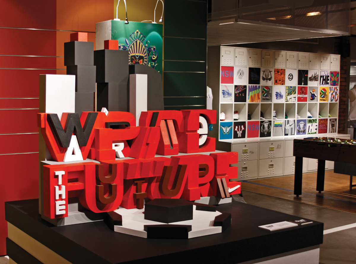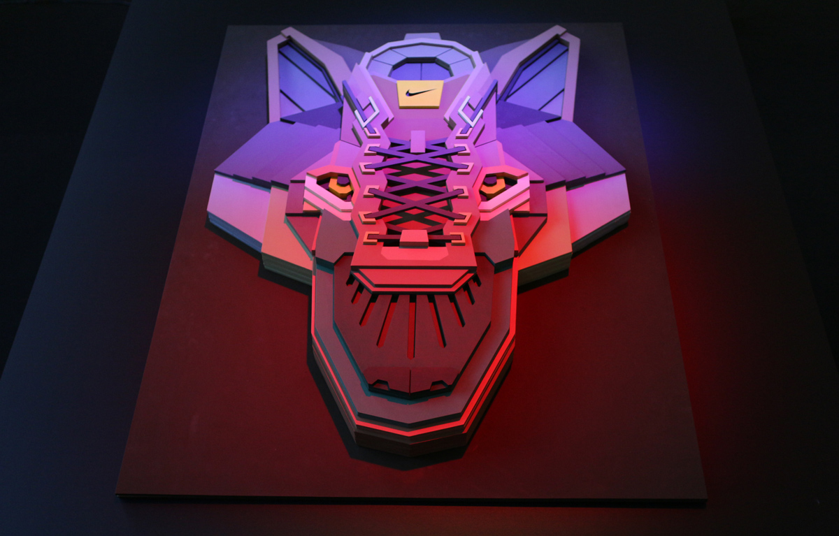 Первую работу из этого материала я сделал в 2009 году для небольшого выставочного проекта Adidas 60 Details, который организовывали мои друзья. Каждому художнику выдали по фанерному силуэту кроссовка, и он должен был его расписать. Я решил как-то дополнить оформление и выпилил часть графических элементов из фанеры. Так как тогда я ещё работал с буквами, то сделал из кроссовка композицию с латинским алфавитом.