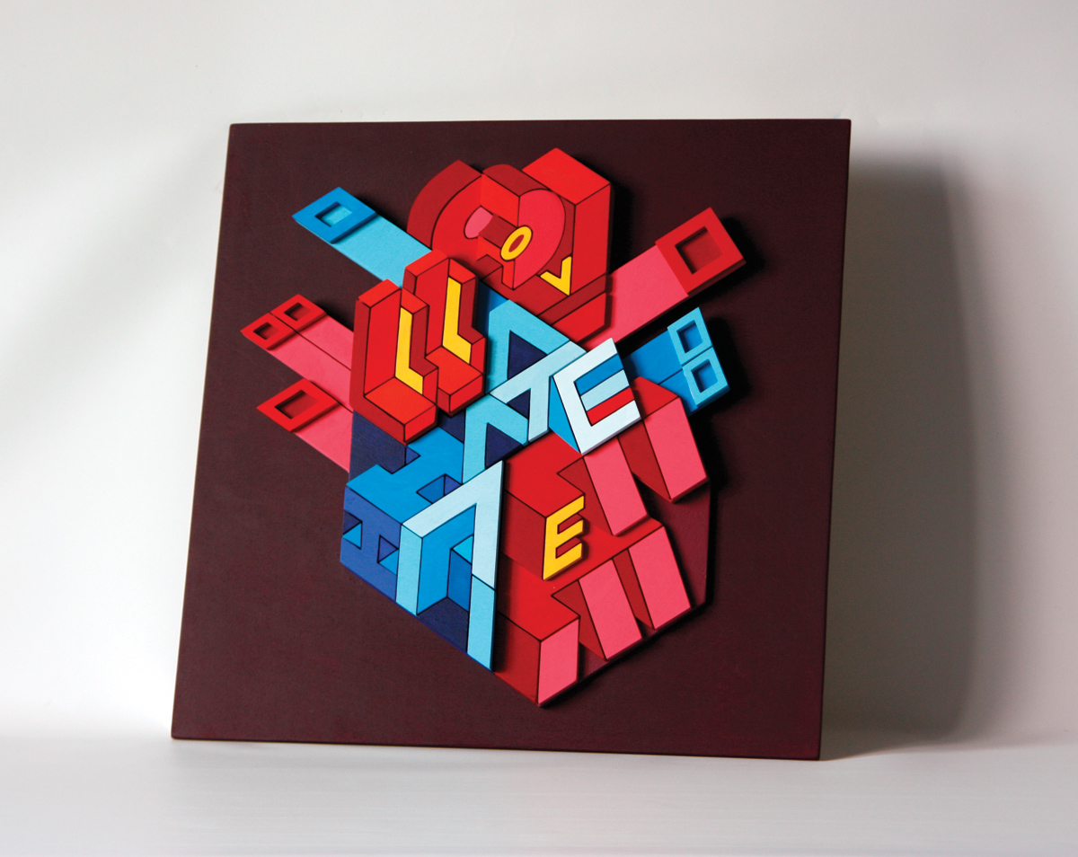 Дело в том, что если вы хотите развивать собственное творчество, то рано или поздно вам надоест писать одно и то же, пусть даже разными способами. Так было и со мной. А после того как я попробовал себя в типографике и иллюстрациях с использованием букв, я понял, что и этот этап пройден, нужно двигаться дальше. Сейчас я уже думаю о том, что придёт на смену геометрии и фанерным произведениям. Вообще, если проследить за моим творчеством, то можно заметить, как оно постепенно меняется. Я специально не удаляю с сайта свои старые работы, как это делают многие художники. Я хочу дать возможность зрителям проследить, каким путем я шёл с 2003 года.