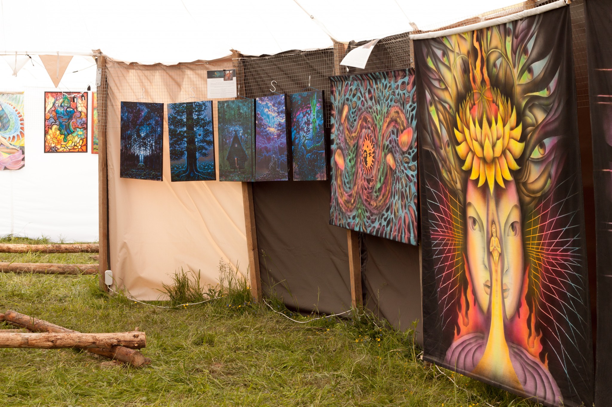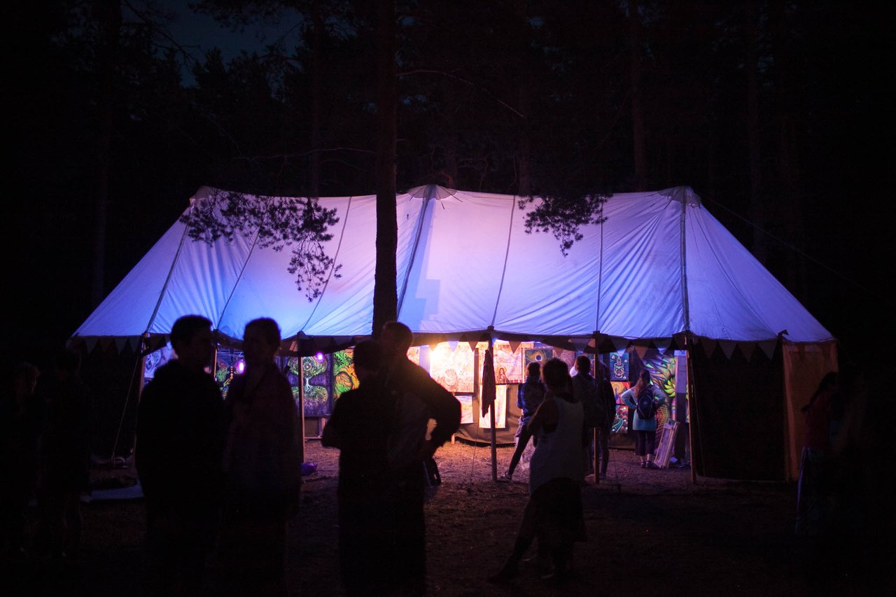 Выездные в лесу делаем всего по паре-тройке штук в год. Больше выставляемся на городских мероприятиях в помещениях, так как вывезти галерею в подготовленное для экспозиции пространство гораздо легче, чем везти за сотни километров картины и шатры, чтобы создавать пространство в лесу с нуля.
