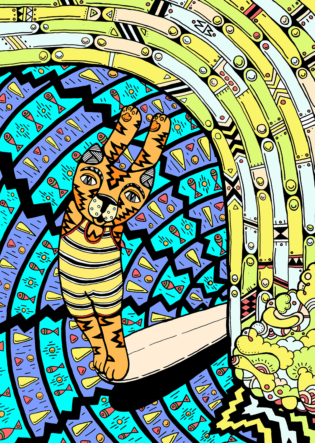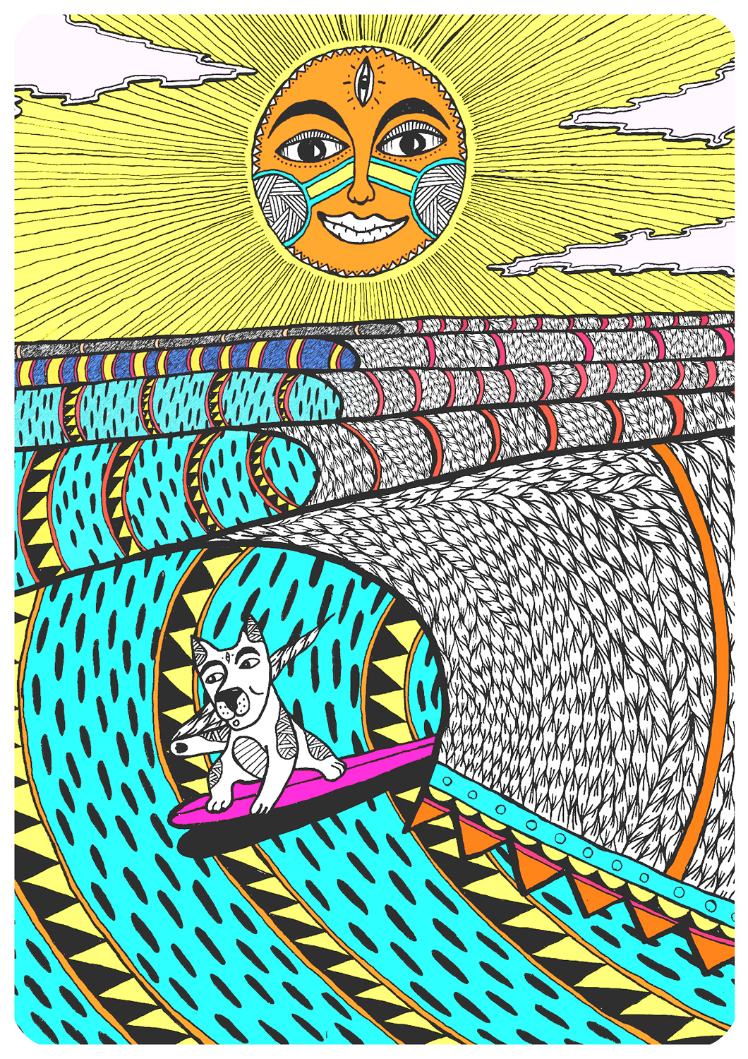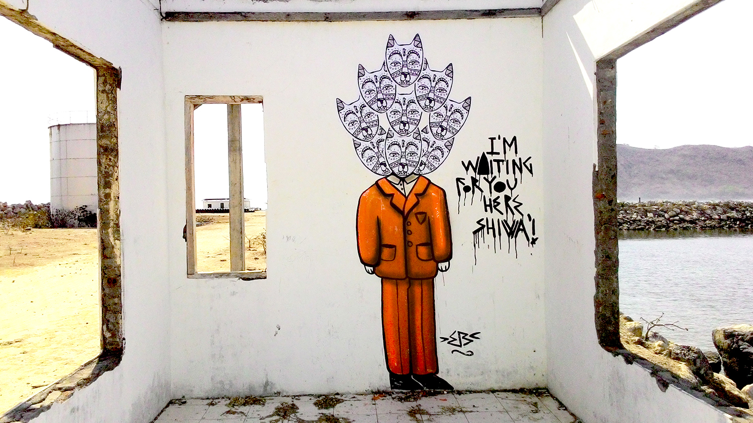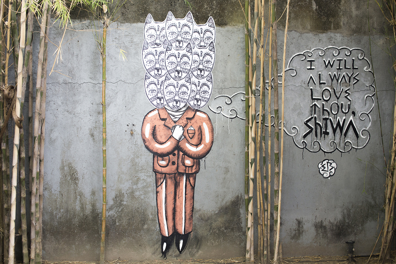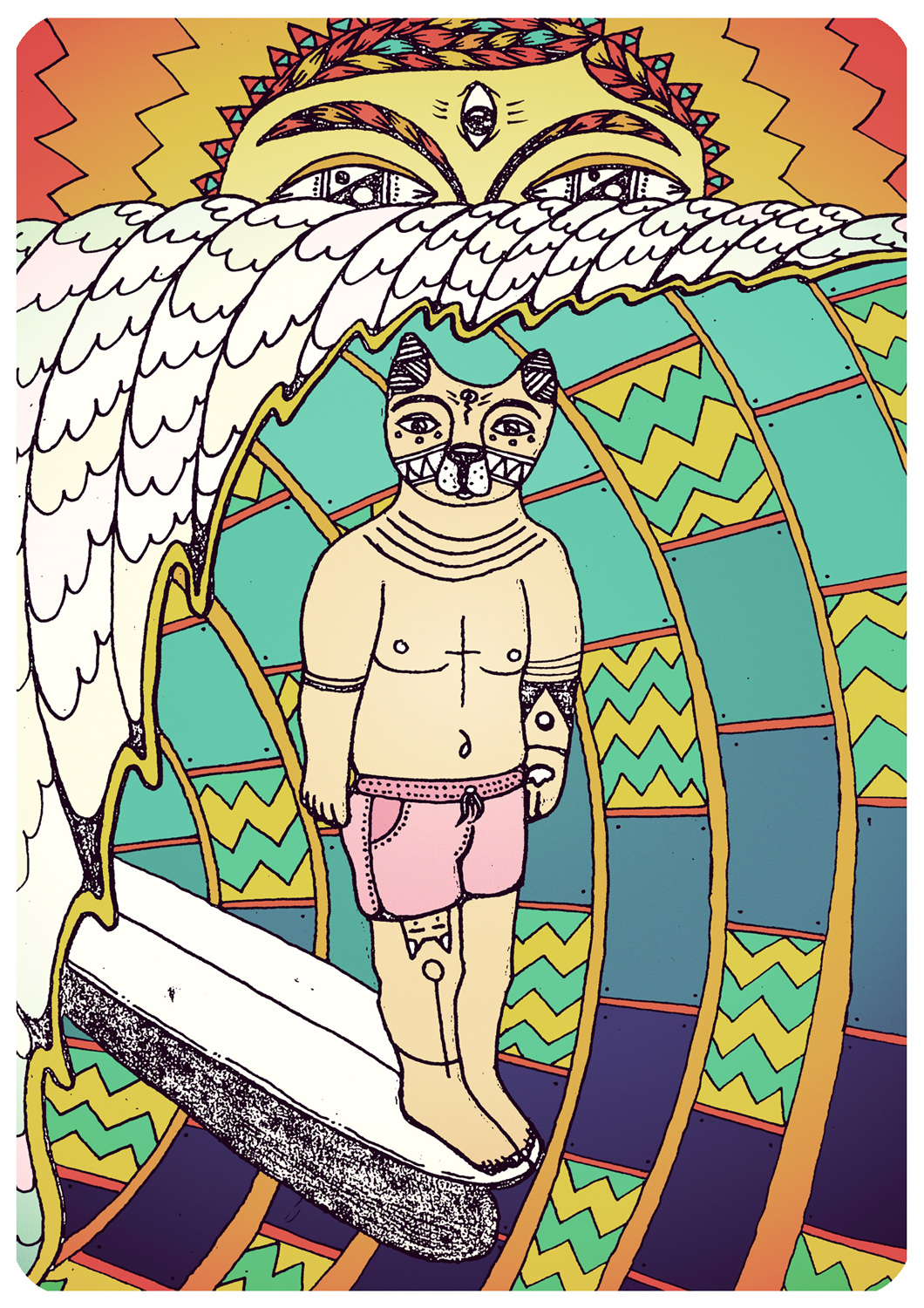Моя самая любимая работа, а, точнее, проект, называется «Вишуф». Изначально я рисовал Уфу, это моя собака, её имя происходит от UFO (пер. «НЛО»), потому что когда она была маленькой, ее голова была огромна, как у маленьких зеленых человечков. Затем в её визуальном образе на картине начало проявляться нечто кошачье. Потом она стала медитировать и кататься на серфе. А в какой-то момент родился Вишуф. Это бог с телом человека и головой собаки. Первая часть имени взята у верховного бога индуизма Вишну, а окончание «уф» принадлежит моей собаке. У него даже есть небольшая история. Вишуф — одноклассник Ганеши. Они сдружились, потому что не так-то много богов с головами животных. Вишуф служит своему лучшему другу верховному богу Шиве. Он постоянно ждет, следует, любит и принимает его в своем сердце. И главное: он в пиджаке, так как стал первым из существ, кто пришел к просветлению путем офисного менеджера! Этот образ встречается во многих моих работах.