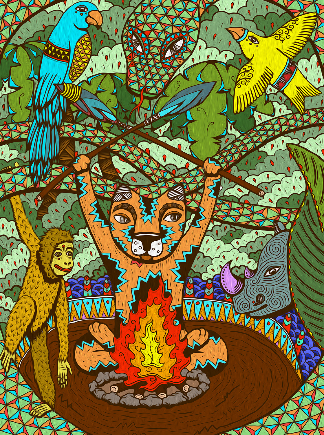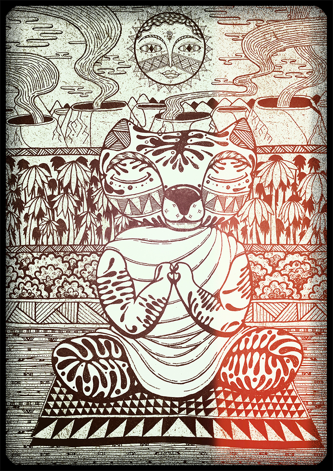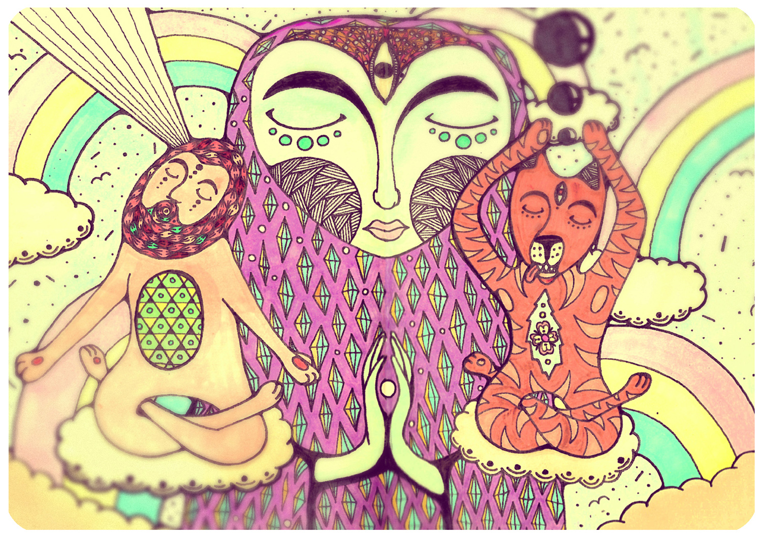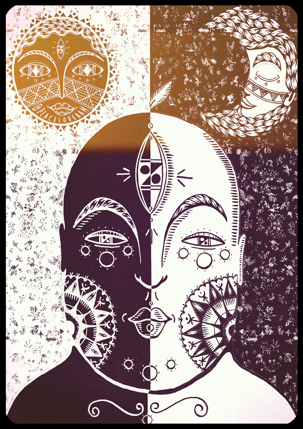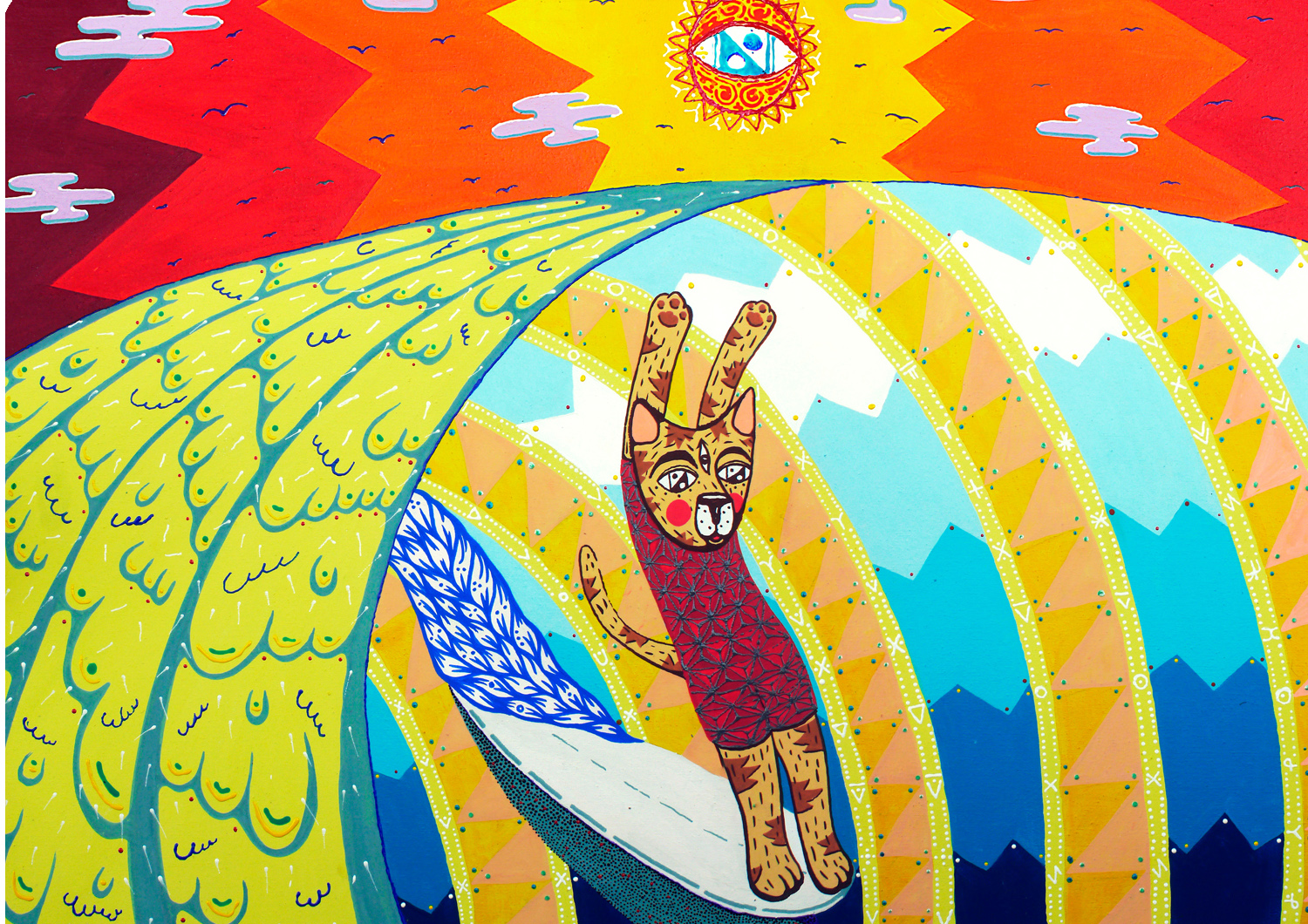 Не скажу, как он правильно называется с точки зрения учебников. Одно время я именовал его наивным искусством, но потом узнал, что такое направление уже было в XIX веке, и, действительно, общие черты с моим творчеством в нём были. Имеется и родство с примитивизмом — я не использую сложные и замороченные формы, фактуры, тона и градиенты. Сейчас больше всего нравится ассоциировать свое искусство с символизмом, потому что я всегда наделяю смыслом элементы орнаментов. Например, треугольник с вершиной внизу — женское начало, квадрат — это устойчивость, а закрытые глаза — спокойствие.