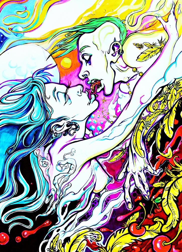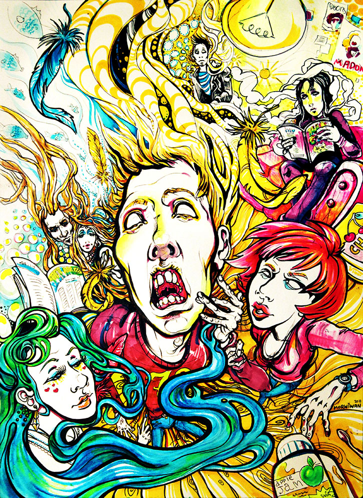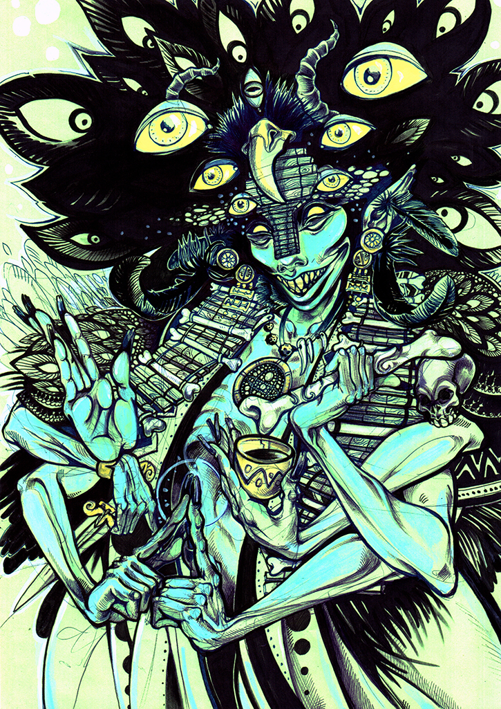 С творчеством этого необычного художника я познакомилась на фестивале «Тримурти-2015». Его эпатажные картины были представлены в галерее из Санкт-Петербурга Art for Mind. Игры разума, демонические образы и психоделические персонажи – такими я запомнила работы Евгения Маркина, известного под псевдонимом Limbic Splitter.