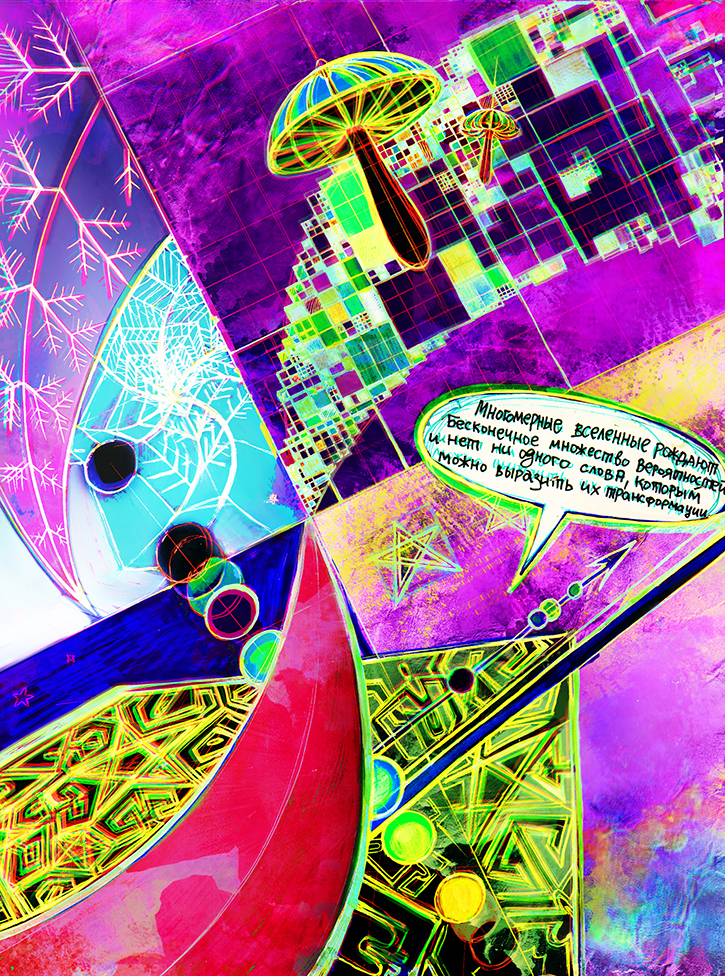 Иногда. Она создаёт интересные эффекты − придаёт композиции некоторый дополнительный объём и внутреннее свечение пространства и объектов. На создание флуоресцентного полотна уходит немало времени, так как я стремлюсь сделать его адекватно − смотрибельным как в обычном, так и в уф-освещении. Это требует двойной работы. Также я прибегаю к классической трёхплановой композиции, что исключает возможность работать в декоративном стиле, которым обычно выполняются психоделические полотна − с цветной заливкой и чёрной обводкой.