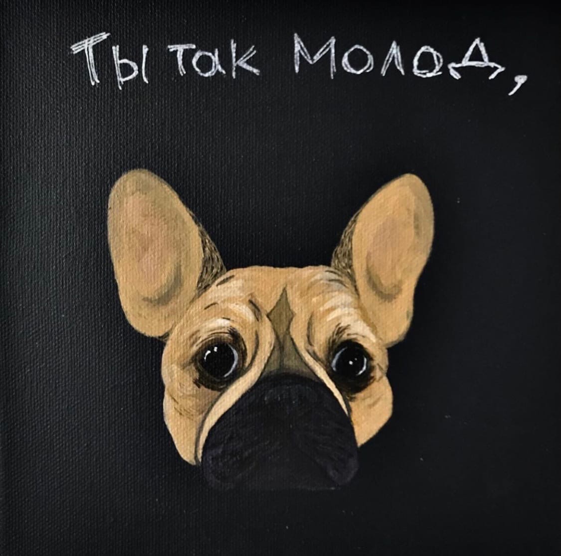 Меня вдохновляет все, что я вижу каждый день. Иногда бывает такое, что я могу подслушать чей-то разговор и вырвать отдельную фразу из контекста. На последней моей картине с мопсом — фраза, подслушанная в Burger King.