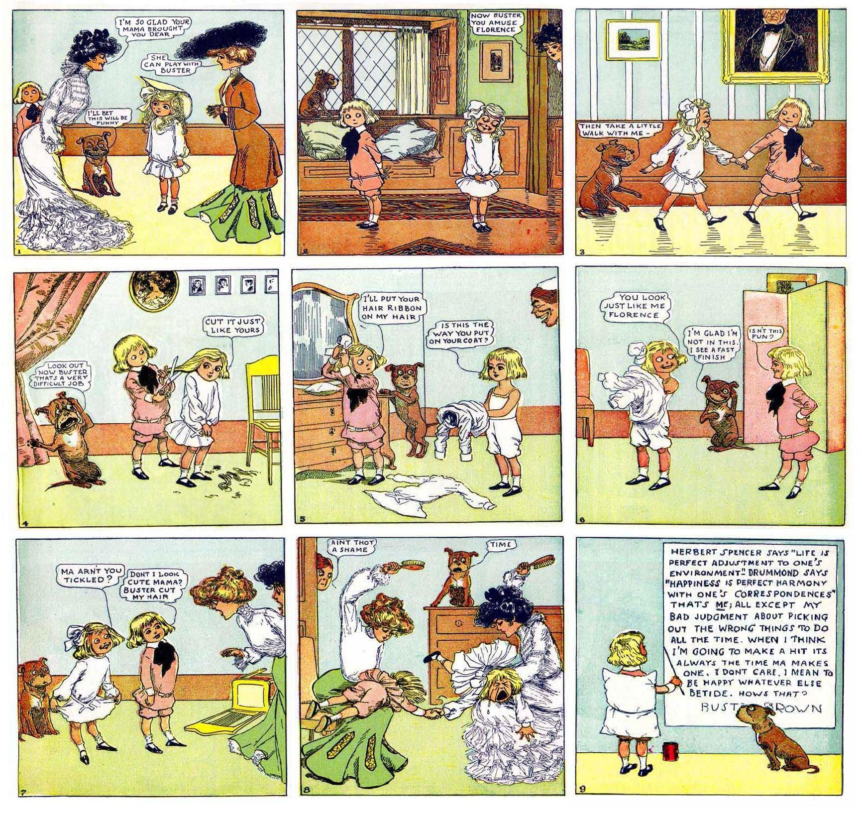 Вскоре на страницах New York Herald появился еще один персонаж комиксов, созданный Аутколтом, – Buster Brown (1902). Мало кому известно, что именно Бастер Браун послужил прототипом всех современных «суперчеловеков» – атлетических гигантов с крупными затылками и крепкими волевыми челюстями. И даже самого Супермена!