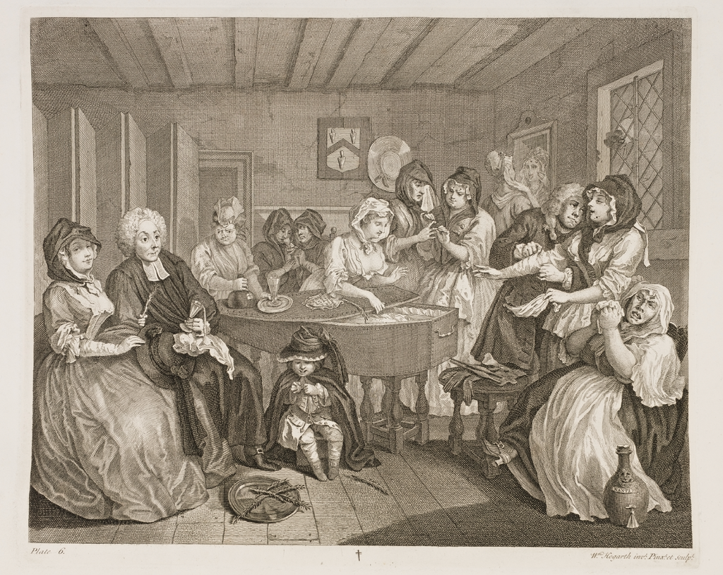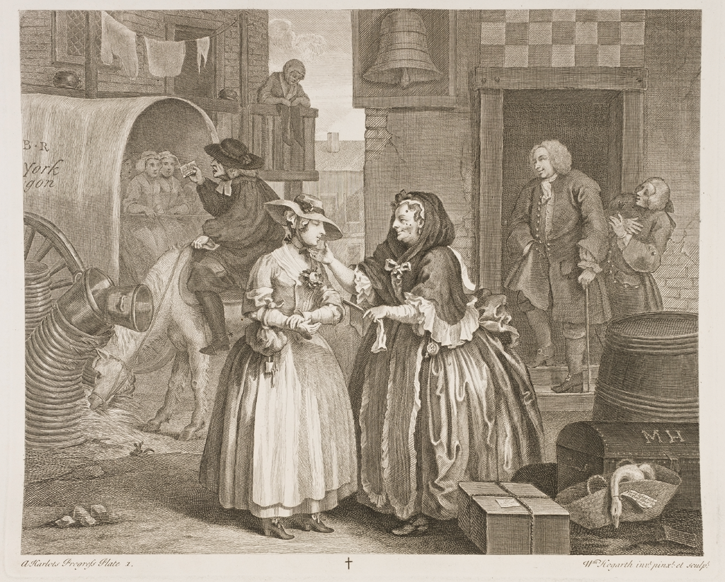 Соединить текст и образ удалось гениальному английскому художнику и иллюстратору Уильяму Хогарту (William Hogarth): в его творении A Harlot's Progress (1734) («Карьера проститутки») им были заложены определенные характеристики комиксов: он восстановил последовательную природу визуального повествования и в то же время изображал действия, как на сцене, придавая им драматический оттенок. Его изобретение явно отличалось от традиционной иллюстрации того времени и необходимо было его как-то назвать. Драматический оттенок требовал постоянного использования так называемого «пузыря» или «облака» (формы, существующей в течение долгого времени).
