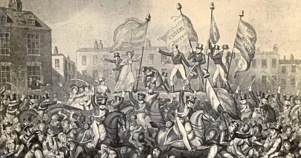 Наступает понедельник 16 августа. Вместо того, чтобы пыхтеть на работе, люди идут на площадь. Не помещающиеся в кадр хлопкопрядильный станки молчат. Народ приползает издалека. Мужья приходят с жёнами. Жёны — с детьми. У некоторых тряпичные растяжки с лозунгами за «всё хорошее». На трибуну поднимается Генри Хант. Вместе с ним всевозможные местные реформаторы и журналисты из нескольких газет.