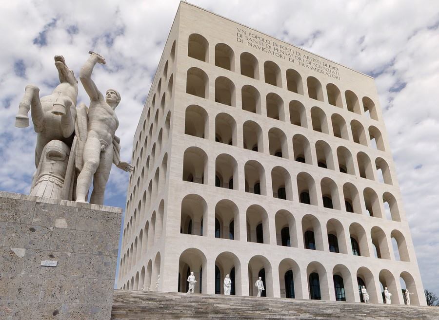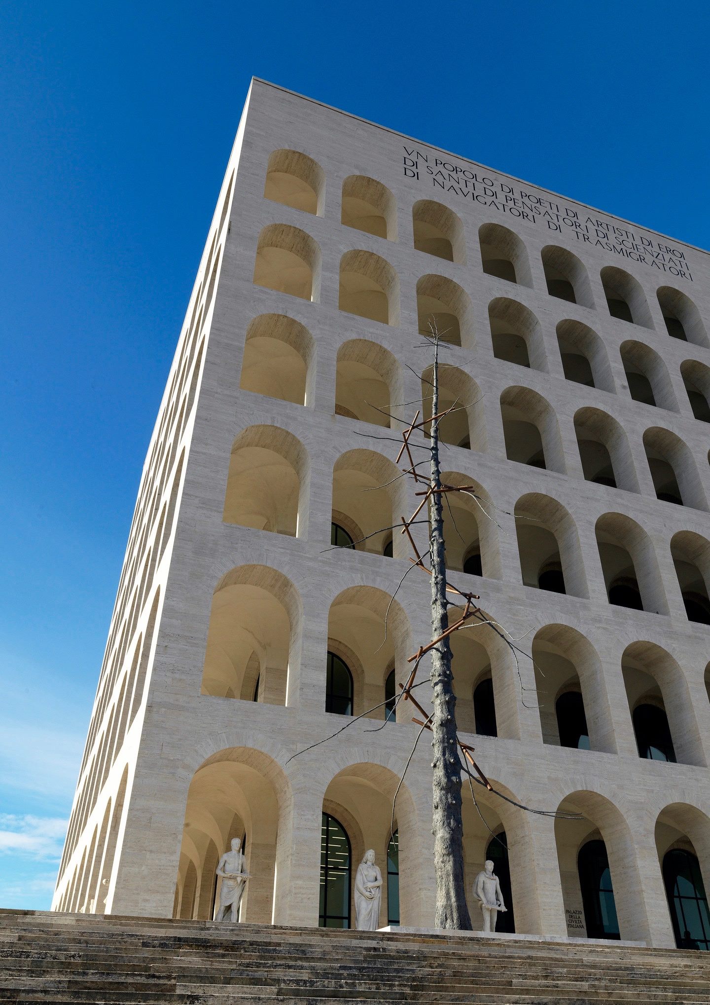 Глядя на эту мощную иконическую форму куба, облюбованную по сторонам серией скульптур, которые решительно привносят декоративное присутствие, навеиваются образы метафизических картин де Кирико, а если присмотреться, можно вспомнить и античные колумбарии для захоронения праха, которые так перекликаются с арочной сеткой фасада Палаццо.