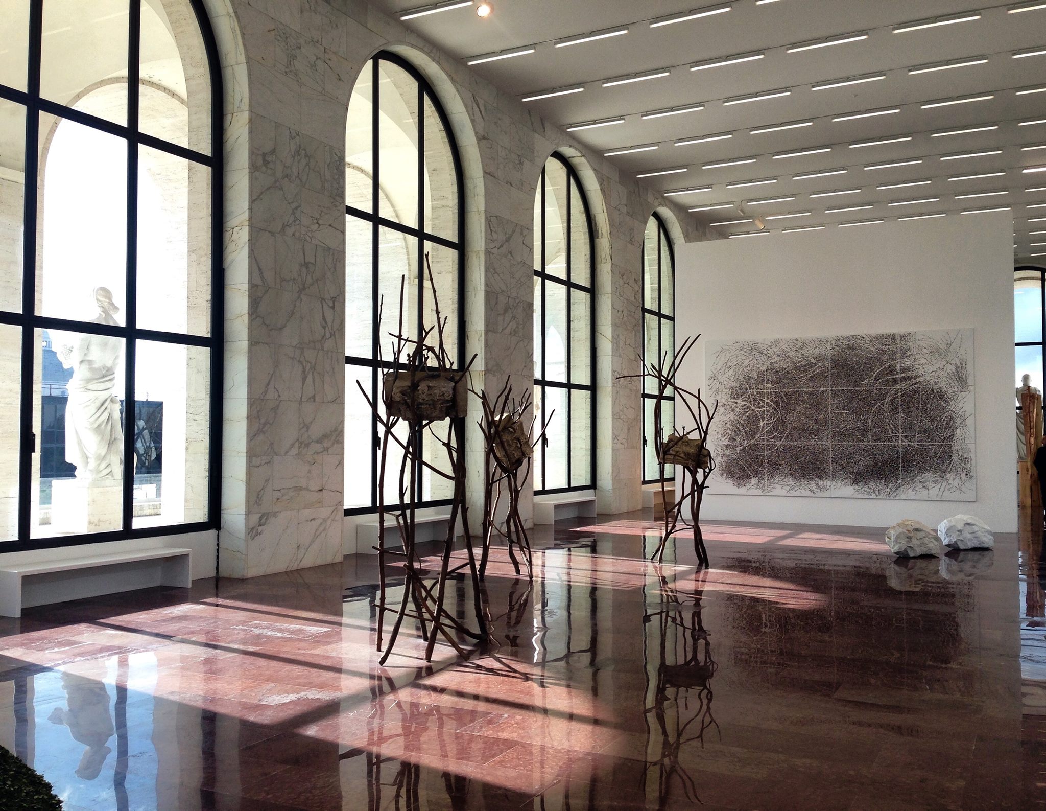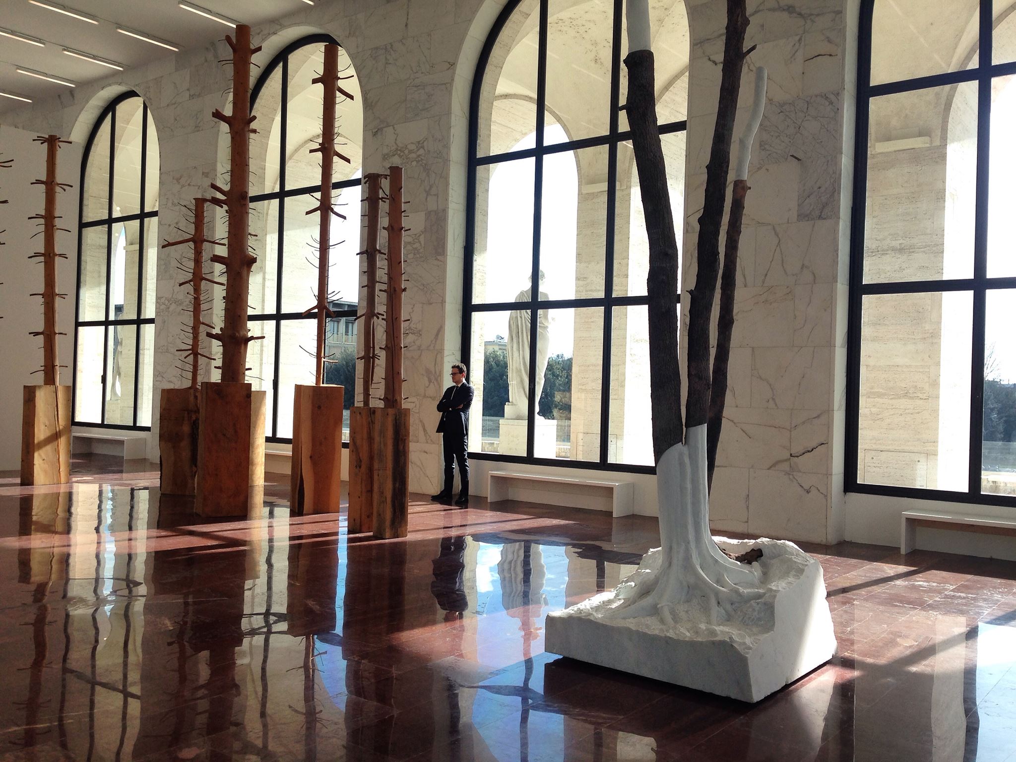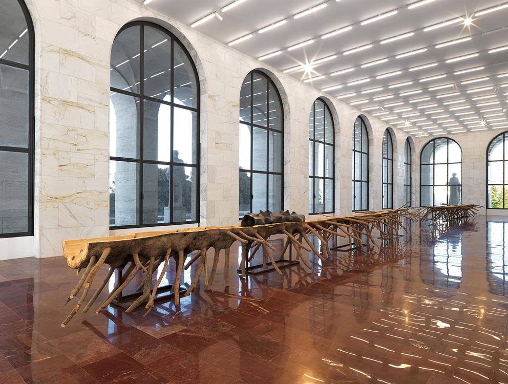 Возвращаемся в просторные залы Palazzo della Civiltà, где потоки светотени и фрагменты отражающихся в мраморной поверхности статуй вовлекаются в заигрывание со стволами и ветками природно-органических произведений Пеноне, которых на выставке представлено пятнадцать, созданных на протяжении почти 50 лет работы художника.