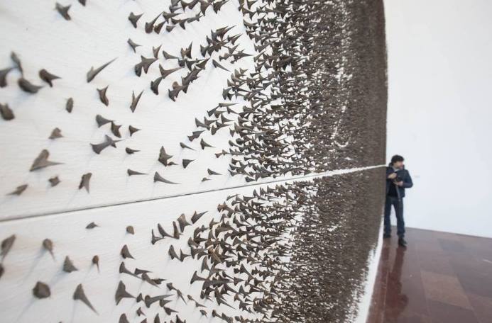 Не очень занимательным абстрактным серым пятном издалека и совершенно удивительным явлением вблизи покажется полотно из серии «Контакт». Контакт действительно достигается при максимальном сближении. Но осторожно, не так близко, можно наткнуться на шипы. Полотно усыпано сотнями шипов акации, напоминающих пиксели, которые складываются, по задумке автора, во фрагменты, похожие на антропоморфные черты.