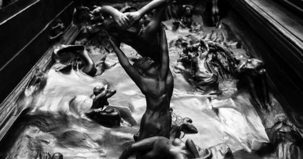 А композиция разрастается, и из ткани врат вылезает фигура, которая отчаянно хочет выбраться наружу. «Я не вижу ничего, кроме бесконечности, и мой разум наполнен страхом падения,» — говорил Роден. И скульптура Икара превращается в падшего ангела, любовник превращается в падшую душу, которая пытается вырваться из бездны, но вот-вот сорвётся вниз.