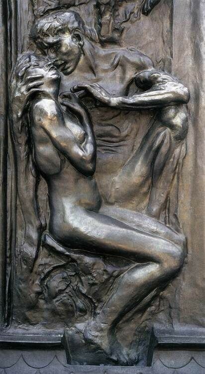 В начале по бокам врат должны были располагаться фигуры Адама и Евы. Но эта идея была отринута. Вместо этого мы видим изображение «Вечной весны». Одной из первых великих скульптур Родена. Поцелуй уводит нас вверх. Это полёт любви, то ощущение лёгкости, воздушности, которое дарит нам любовь.