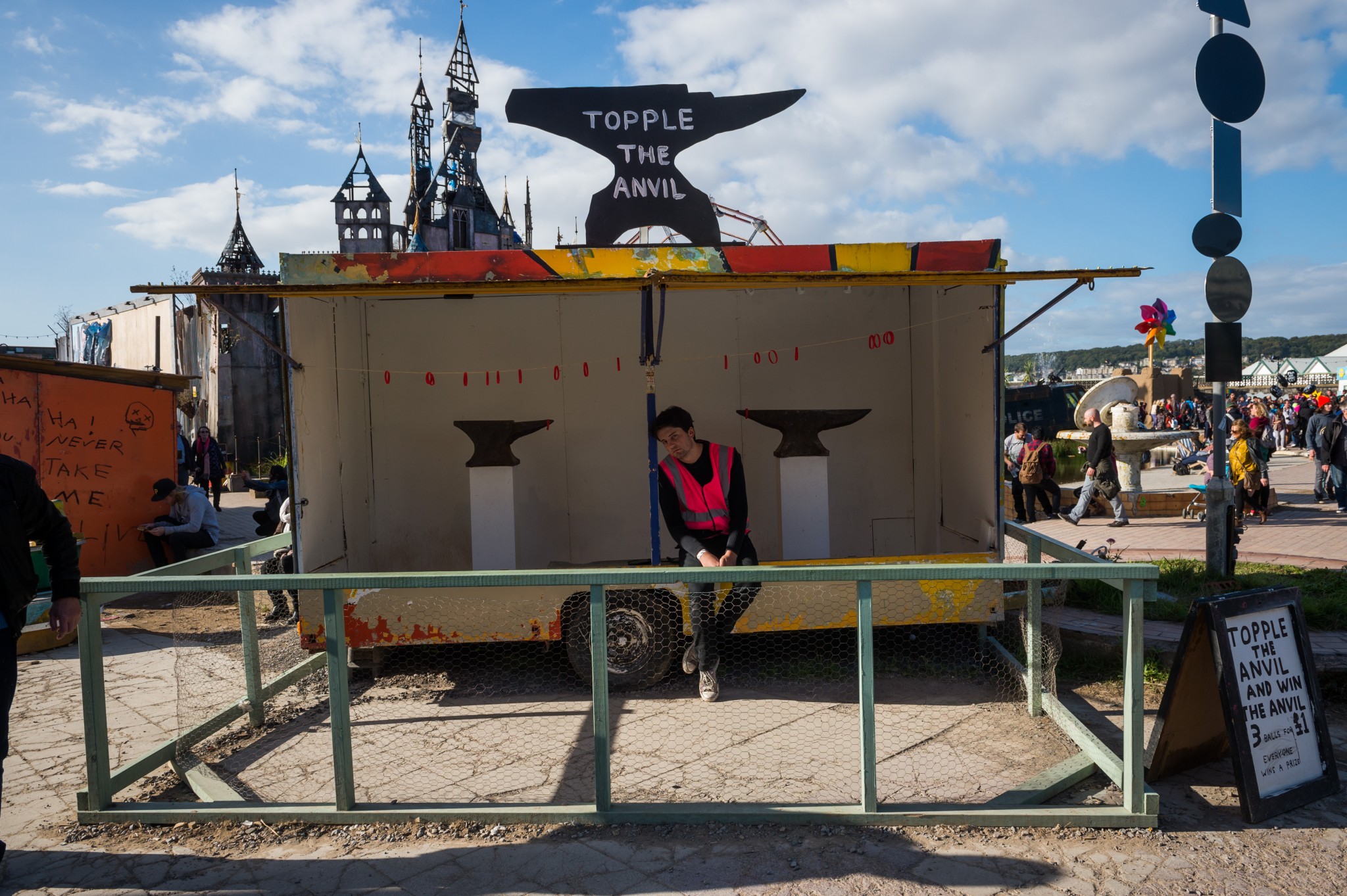 Или вот, супер-аттракцион. За один фунт тебе дают три шарика для пин-понга, которыми ты должен сбить с постамента чугунную наковальню. Победитель в подарок получает… наковальню!