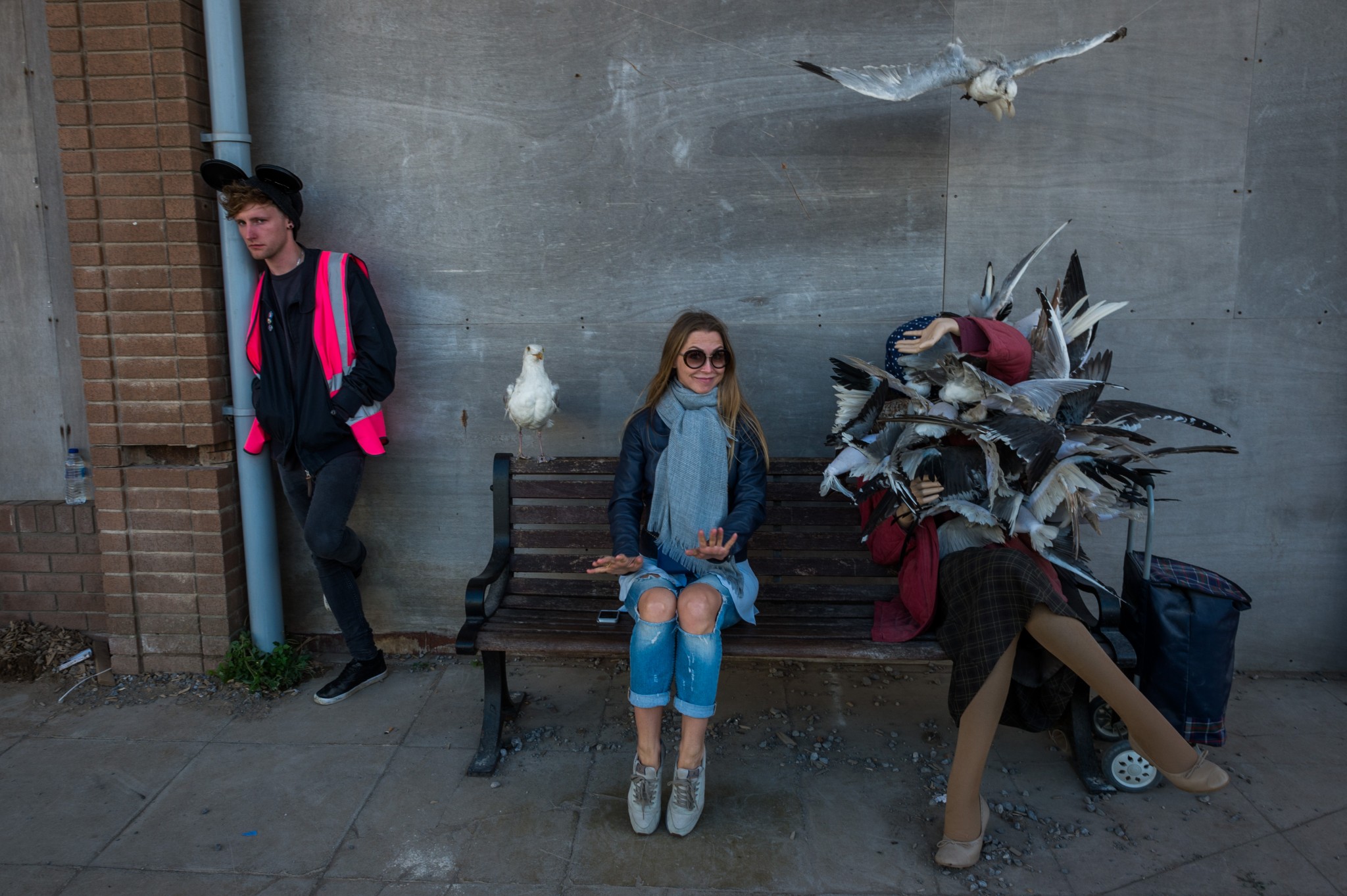 Очередная работа Бэнкси. Лавочка с чайками, напавшими на женщину. Наглых чаек очень много в курортных городах Британии.