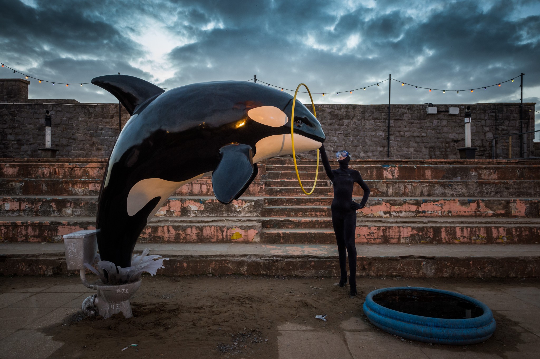 По вечерам в парке проходили концерты, об одном из них я писал. Косатка — еще одна работа Бэнкси. Тут угадывается недавний скандал в парке развлечений Sea World в Орландо. Там после того как одна из косаток съела своего тренера, все решили, что косаткам грустно и тесно. Так что теперь многочисленные активисты борются за освобождение несчастных животных.