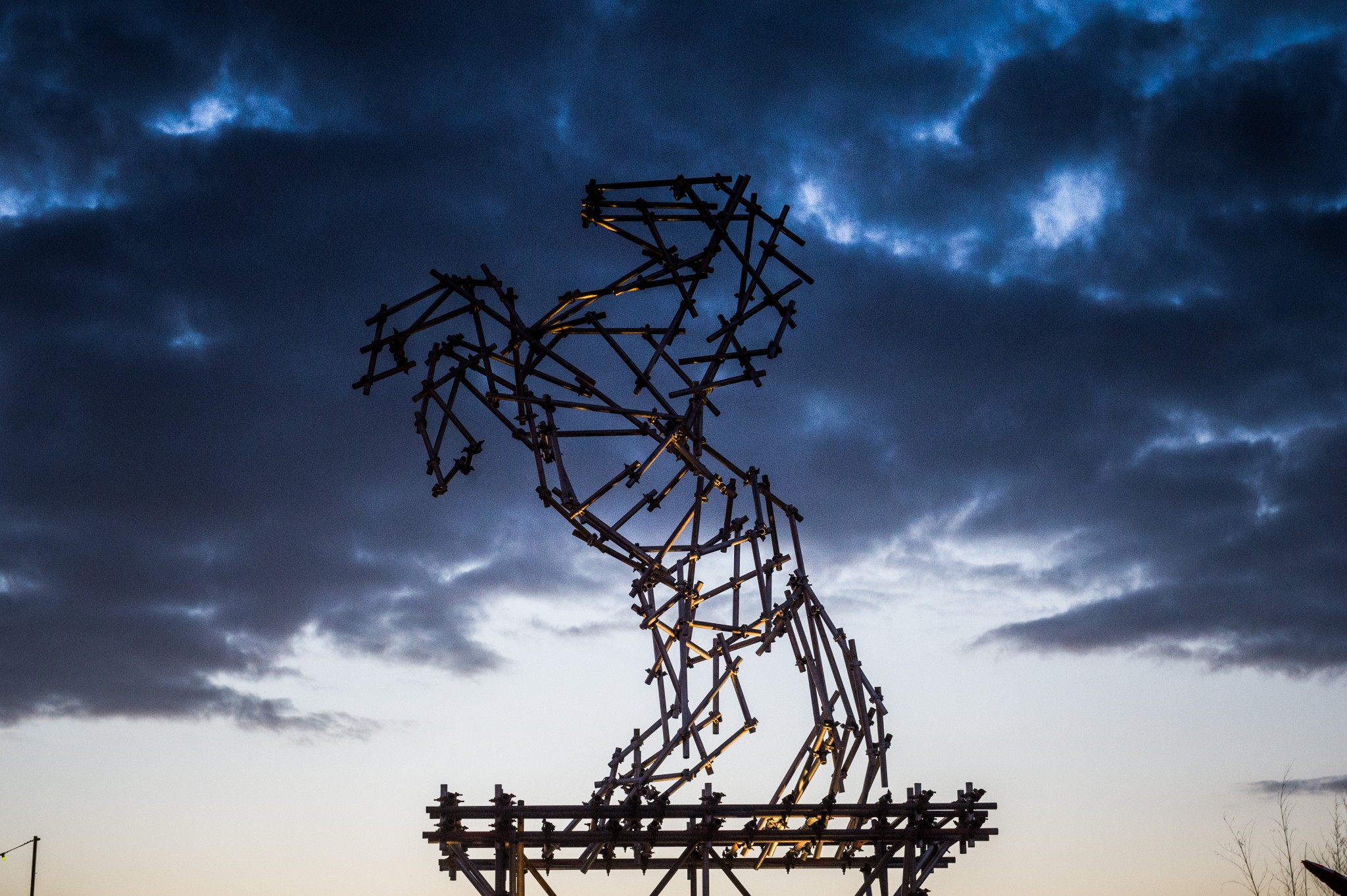 Коня построил художник Бэн Лонг, использующий в своих инсталляциях только повседневные материалы. Например, эта скульптура полностью сделана из строительных лесов.