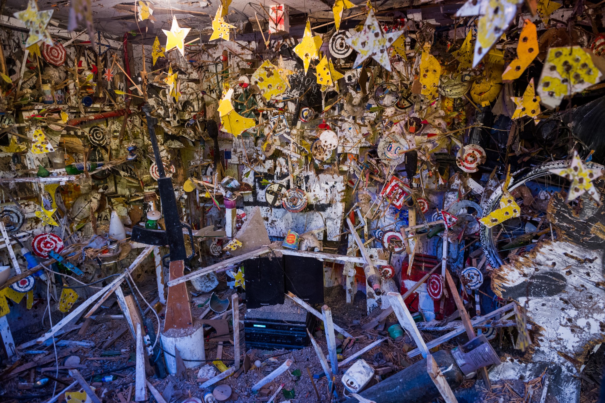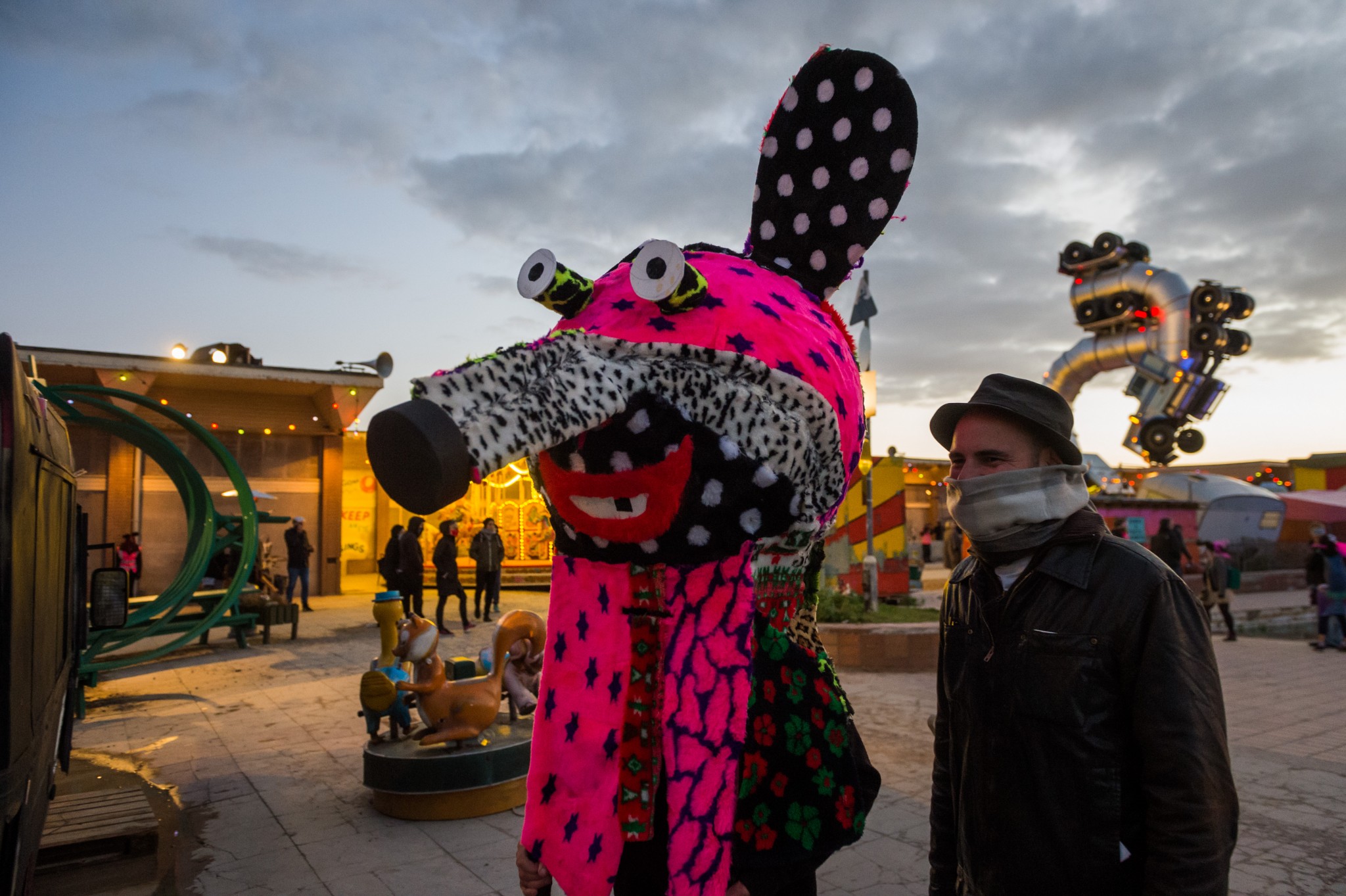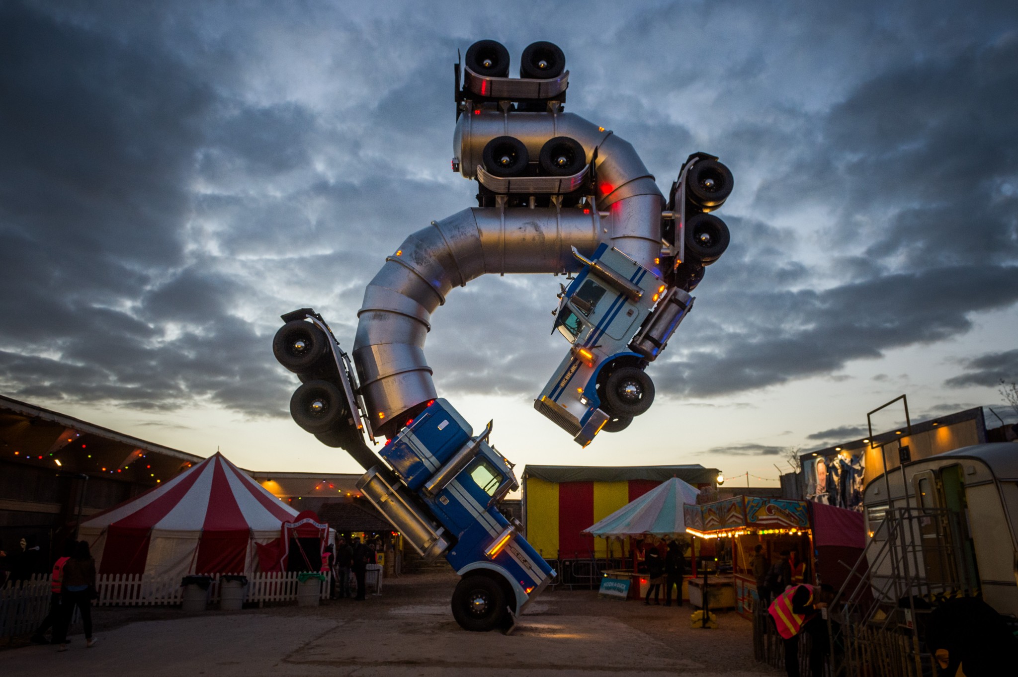 А это одна из самых знаменитых инсталляций. Называется Big Rig Jig. Ее построил Майкл Росс, который, в общем-то, только ей и знаменит. 12-метровая скульптура сделана из двух грузовиков, а наверху находится смотровая площадка. (Смотровая площадка была у этой штуки на Burning Man, на нее нужно было лезть сквозь всю скульптуру).