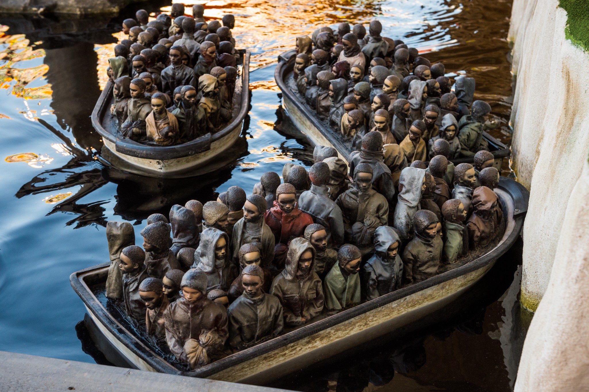 А это аттракцион с беженцами! Если приглядеться, можно увидеть четыре руля. За пару фунтов тебе дают порулить лодками с беженцами или полицейским катером. Задача полицейских − блокировать лодку с беженцами.