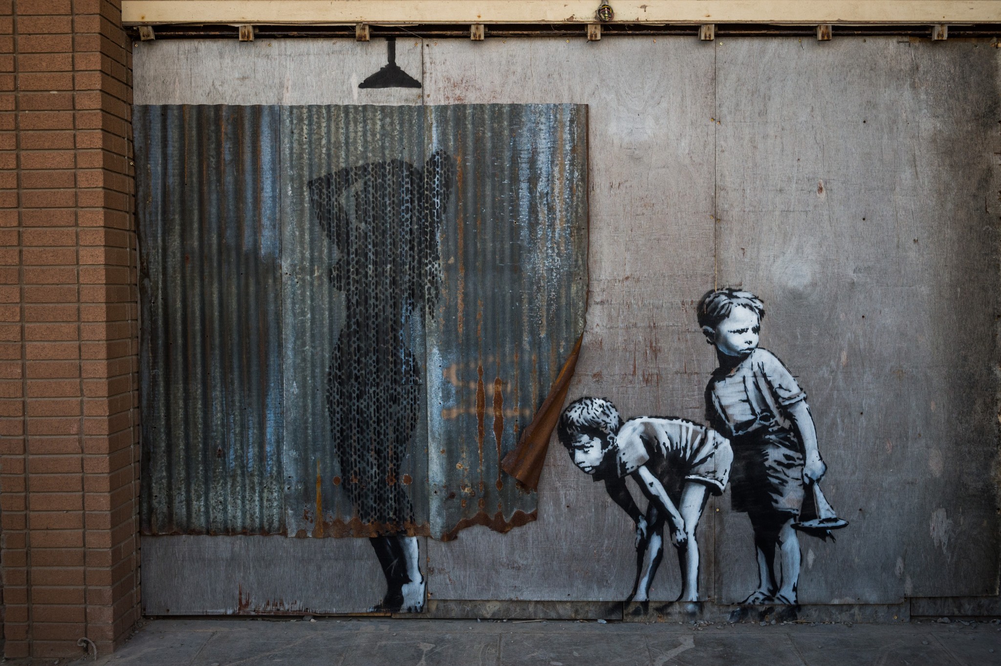 Для парка потрясений Бэнкси создал десять новых работ. В их числе − инсталляция с погибшей Золушкой. В ней легко проглядывается ассоциация с гибелью принцессы Дианы. Перевернутая карета, на заднем плане − скутер преследователя и десяток папарацци, которые освещают место аварии вспышками камер. Очень сильная работа.
