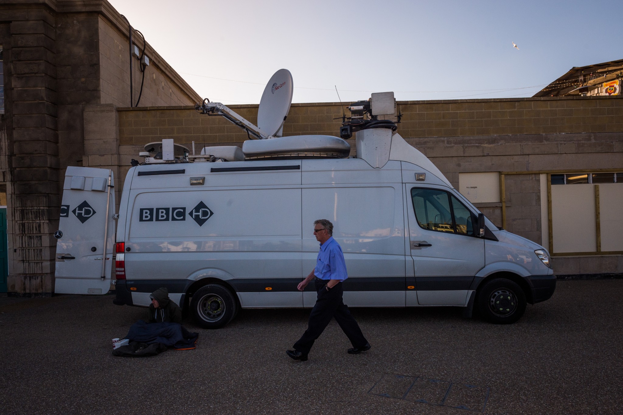 Вот непонятно, это тоже современное искусство? Или просто попрошайка сел около фургона?