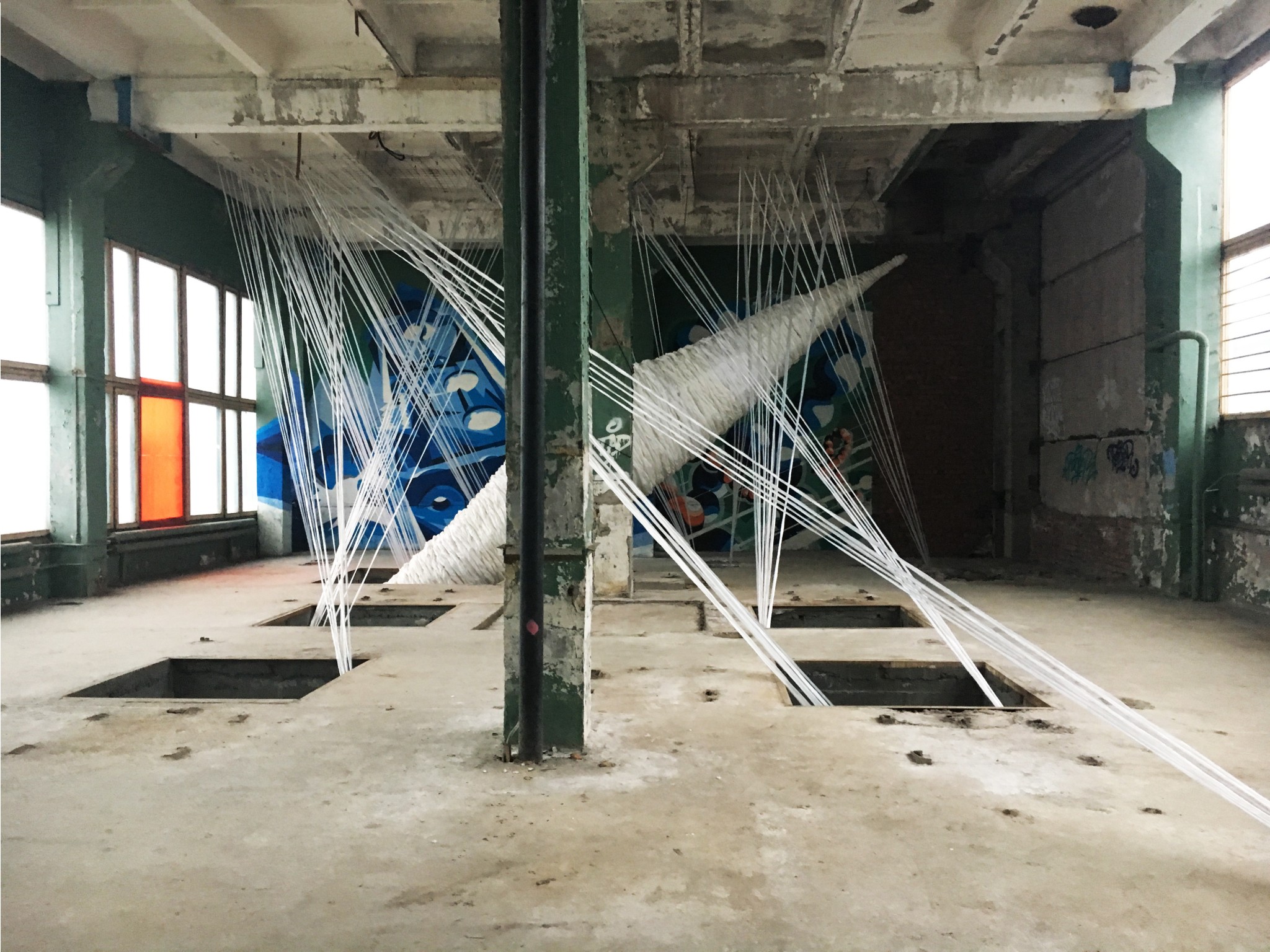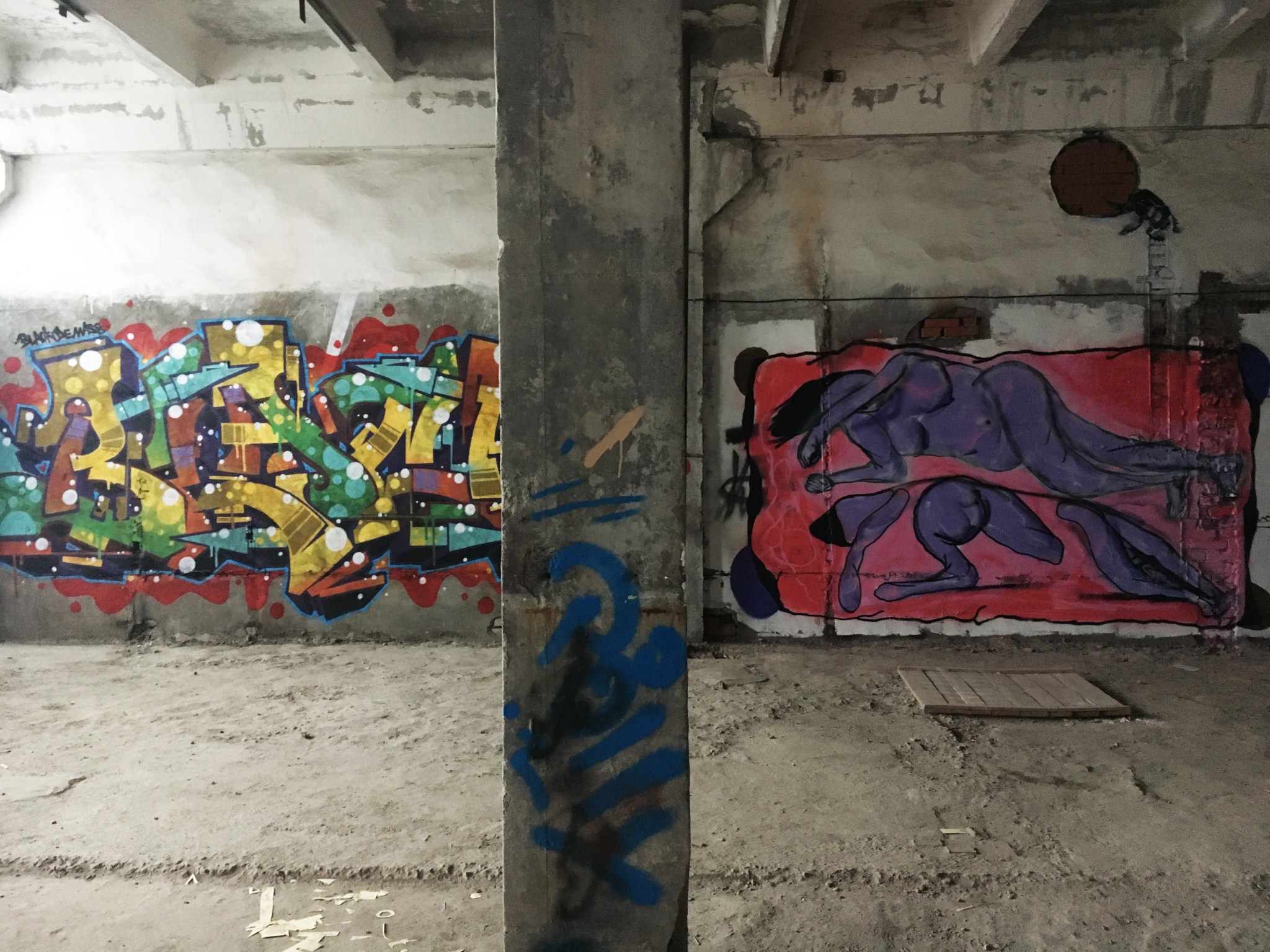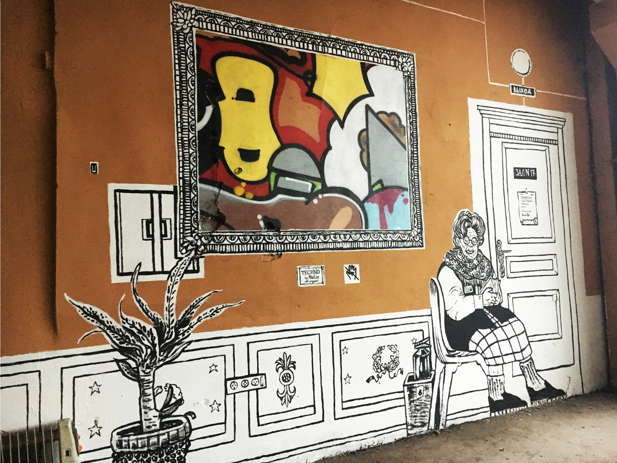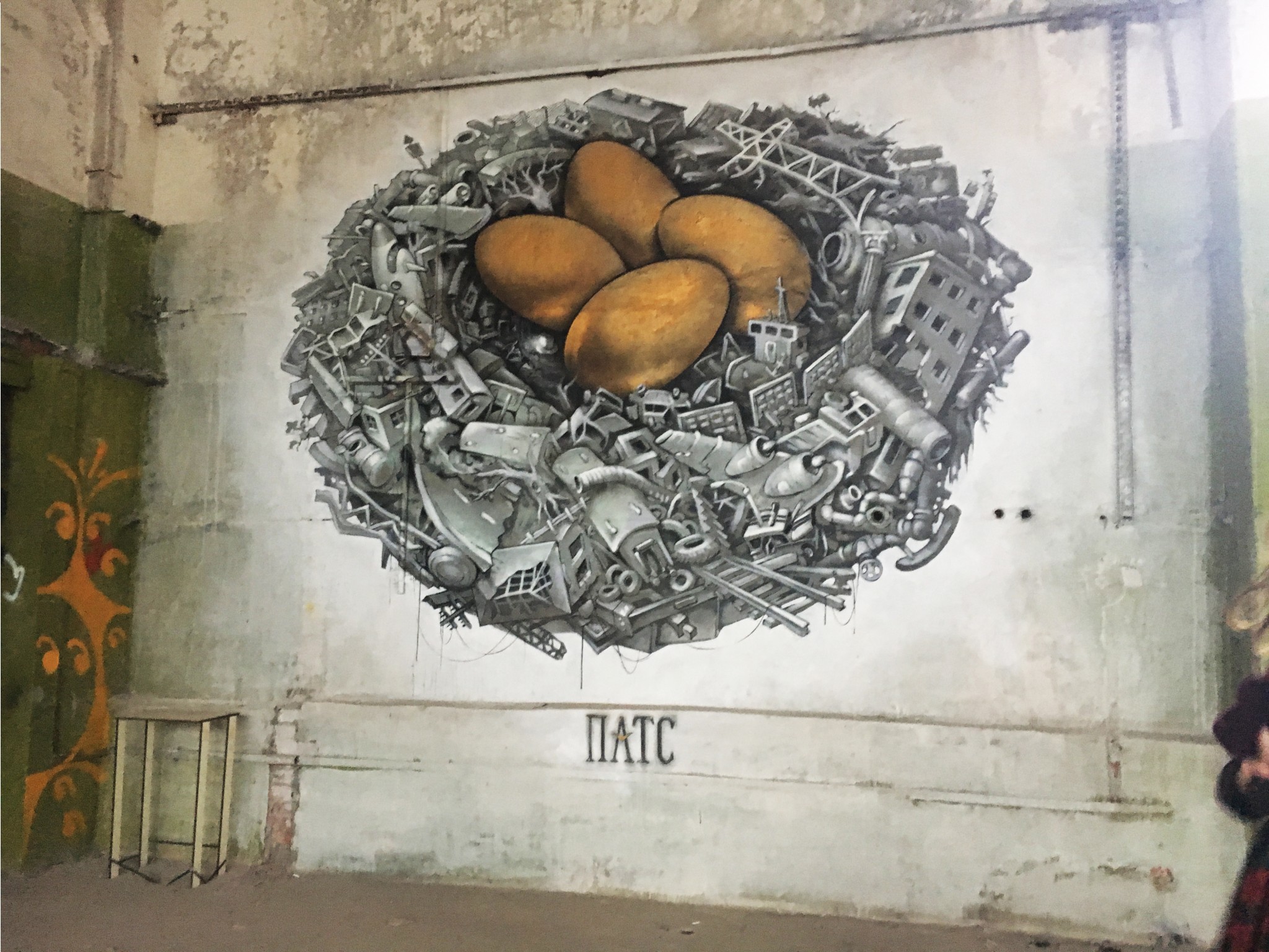 Среди рядовых граффити попадаются инсталляции уже известных художников. В одном из помещений взгляд от стен притягивает к себе чайка Hioshi, художник сам написал в музей с просьбой сохранить ее. Удивительно, но при случайном расположении инсталляции ее элементы четко совпали с разрушениями на поверхности пола. Чайка нашла идеальное место.