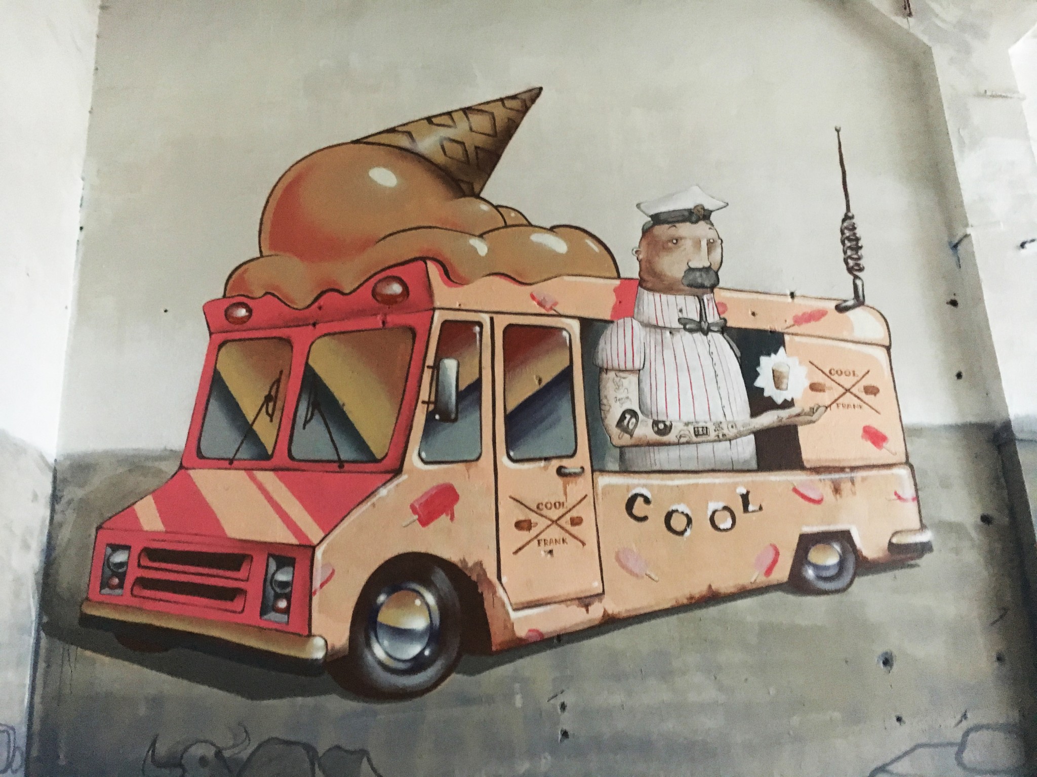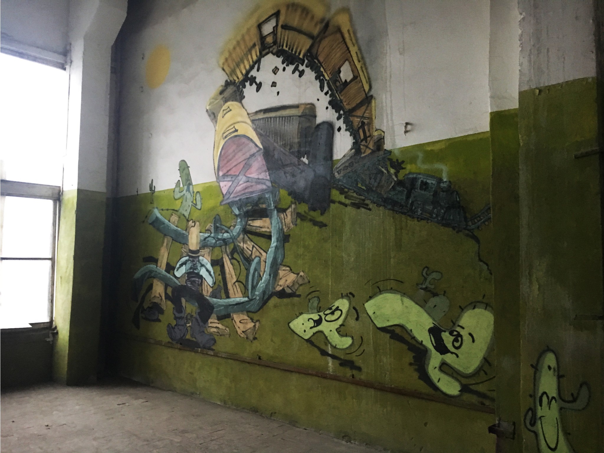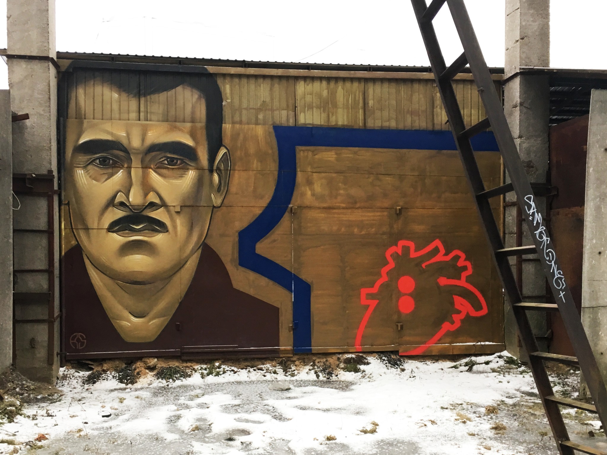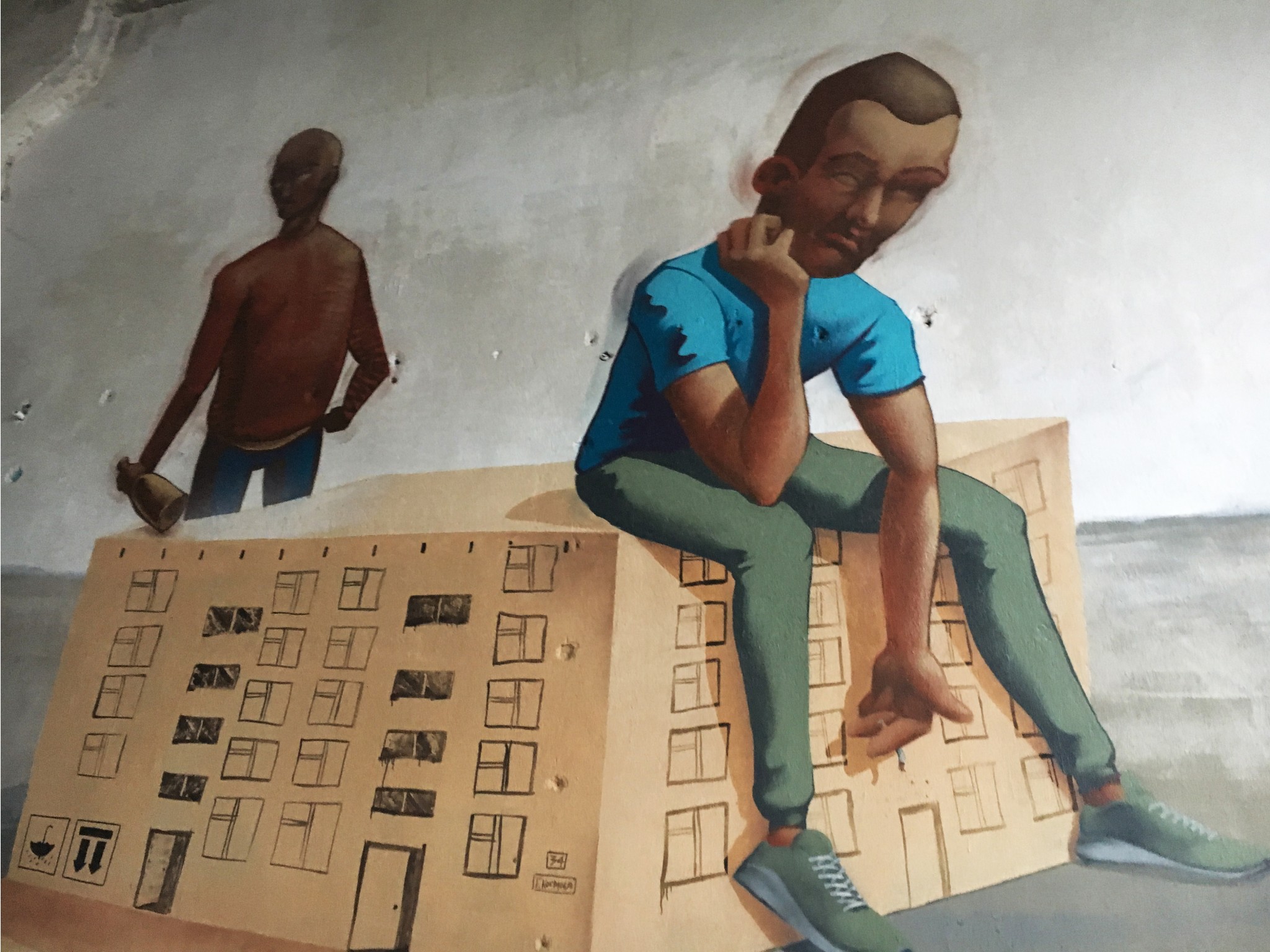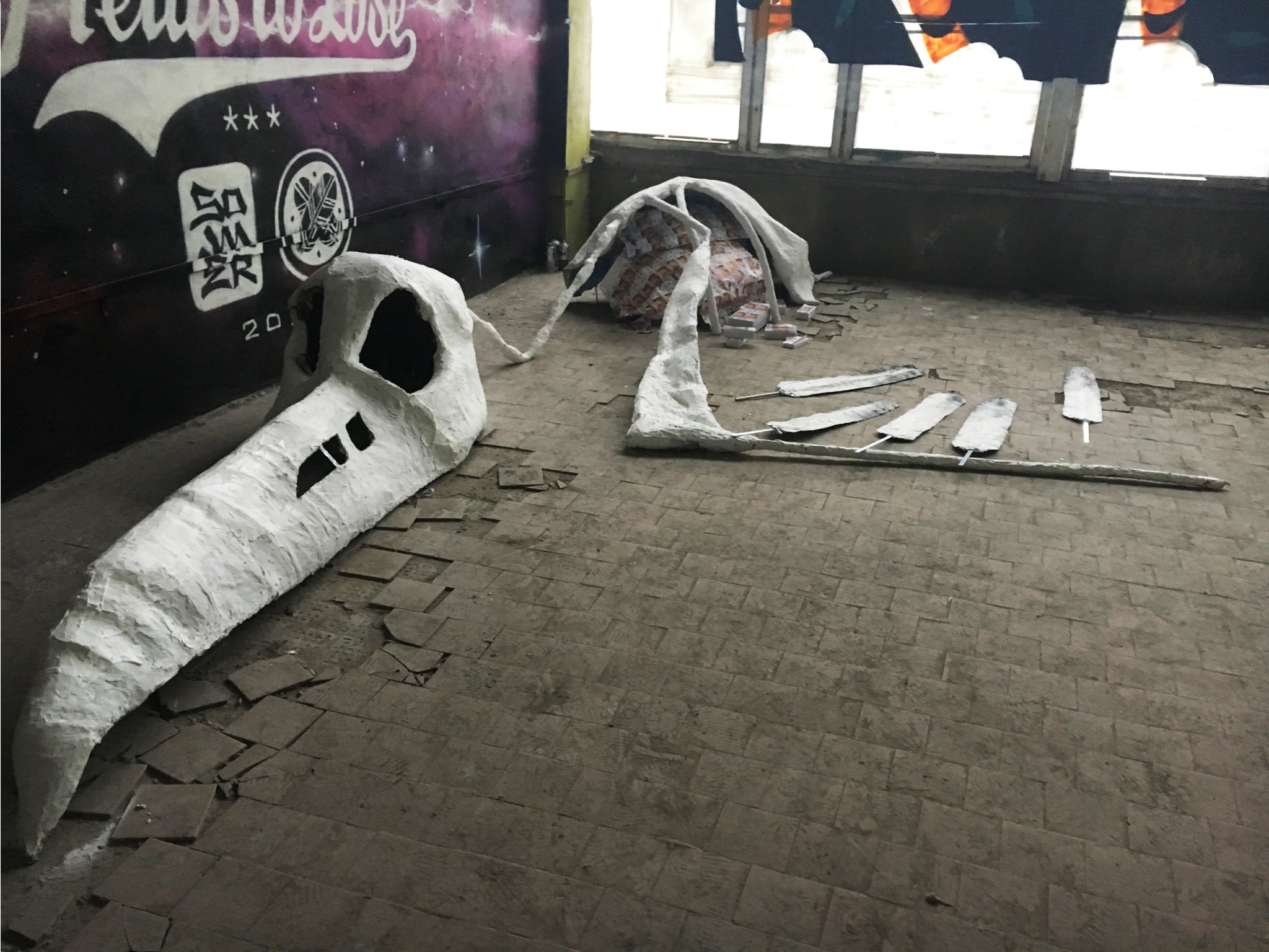 Среди рядовых граффити попадаются инсталляции уже известных художников. В одном из помещений взгляд от стен притягивает к себе чайка Hioshi, художник сам написал в музей с просьбой сохранить ее. Удивительно, но при случайном расположении инсталляции ее элементы четко совпали с разрушениями на поверхности пола. Чайка нашла идеальное место.