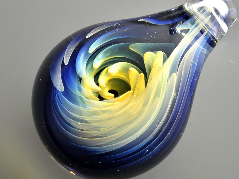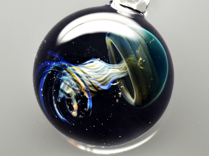 Продумывая окружающее пространство, мастер обращается к таким материалам, как подкрашенное стекло и спирали из него, маленькие кусочки золота (для имитации звезд) или крошечные пузырьки воздуха. Золотая пыль и пузырьки, окружающие планету, отражают свет, который самым неожиданным образом меняет внешний облик произведения. Каждая работа мастера снабжена небольшой стеклянной петелькой, позволяющей носить произведение как подвеску или брелок.