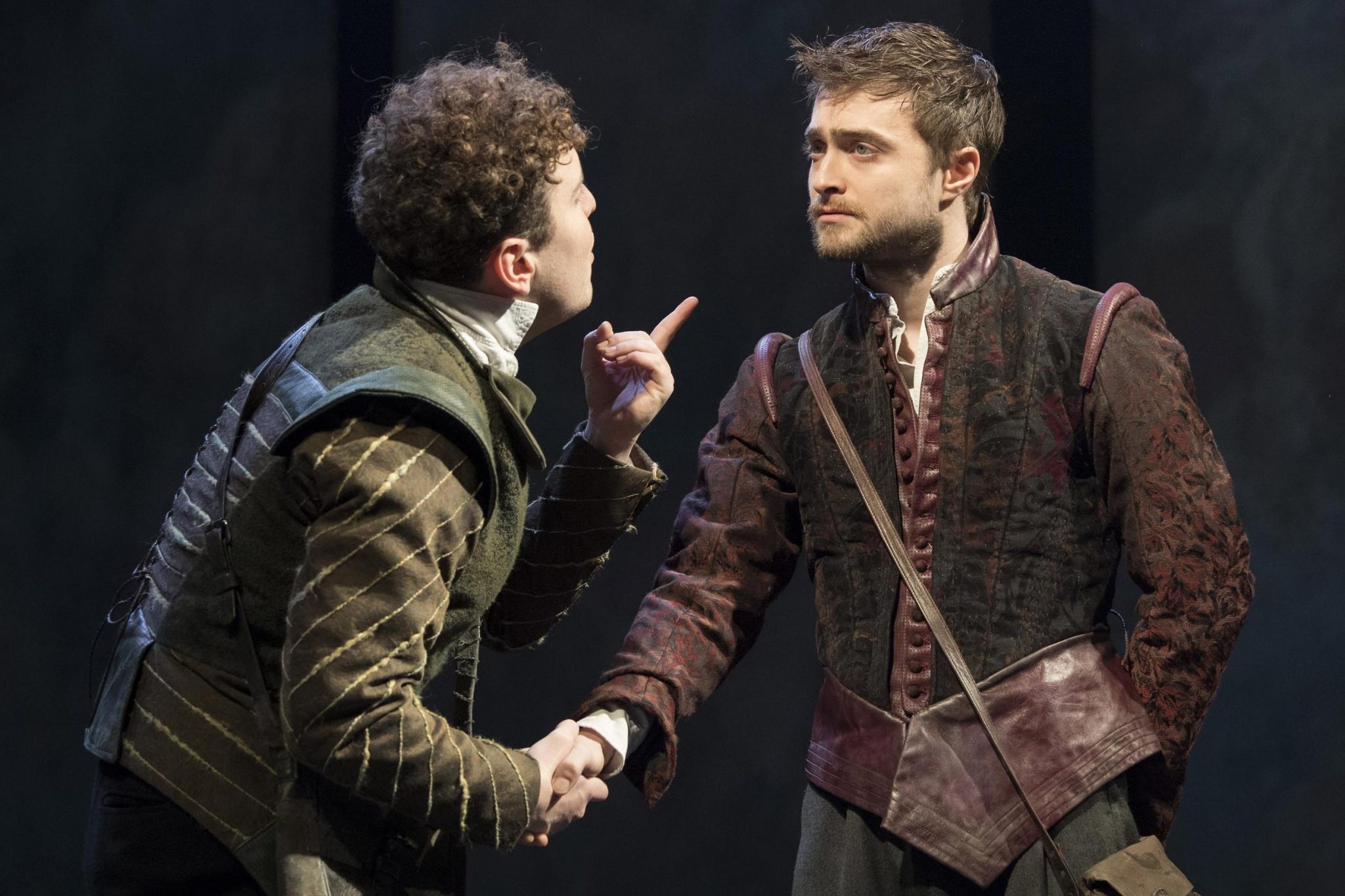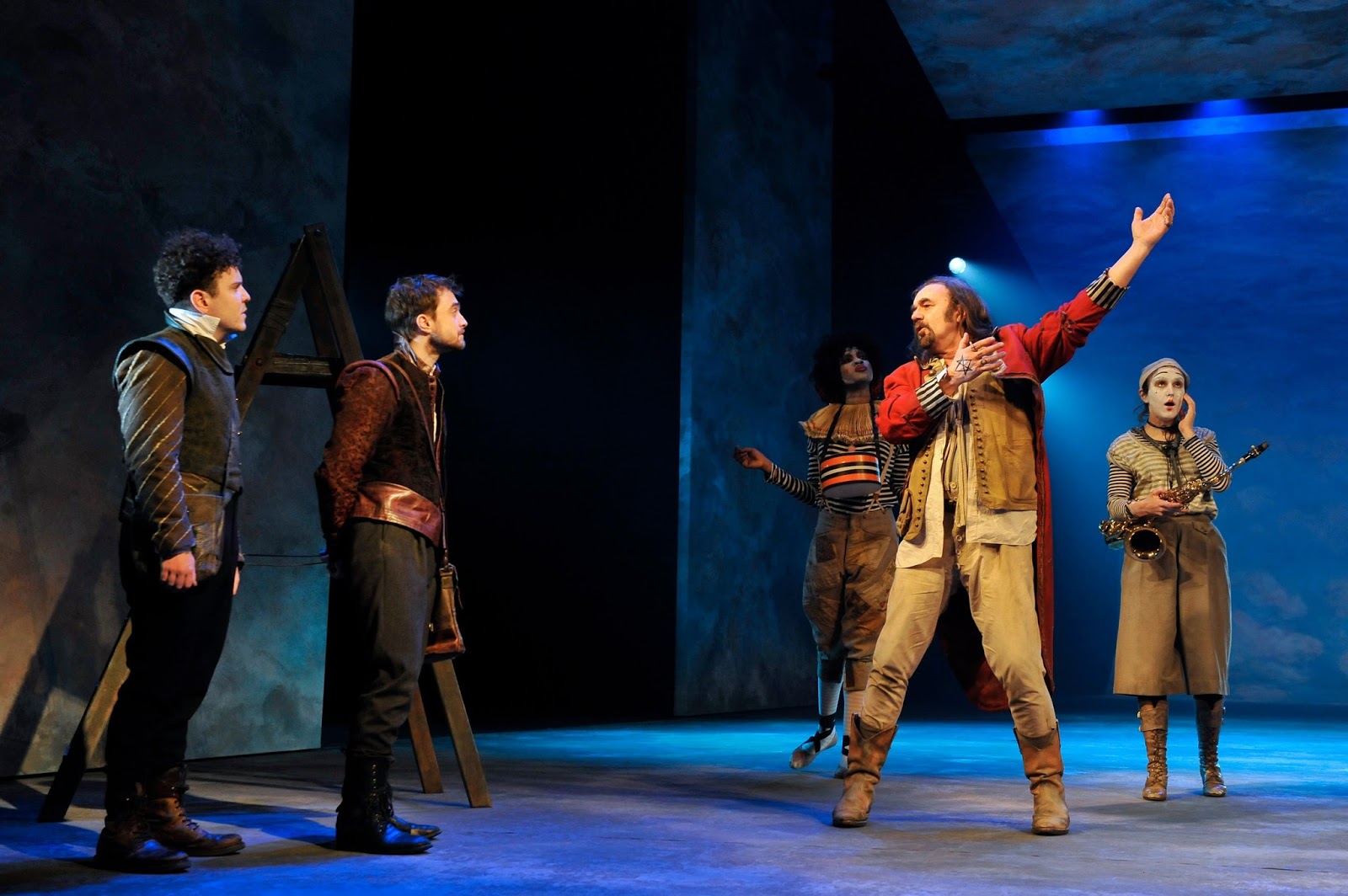 А потом началась пьеса. «Розенкранц и Гильденстерн мертвы». Сразу стоит сказать, что 70% действа занимает взаимодействие великолепного дуэта уже называемых мной актеров - Дэниела Редклиффа и Джошуа МакГуайра. Однако получать удовольствие я начал не сразу - всему виной языковой барьер. Несмотря на то, что в школе я времени зря не терял и сегодня довольно неплохо знаю английский, язык, на котором говорят в театре «Олд Вик», для меня недосягаем. Он идеален. Он как музыка - такой же прекрасный, но такой же сложный для понимания. Я был вынужден читать русские субтитры, и из-за этого первые сцены прошли для меня только на уровне фабулы. Сразу бросились в глаза чернокожие актеры. Экзотика. На подмостках наших театров их нет. Конечно, немного перестаёшь верить в натуральность происходящего, когда героям даёт задание чернокожий датчанин Клавдий, или говорит финальную речь чернокожий норвежец Фортинбрас, но это проходит, они не так часто появляются на сцене.