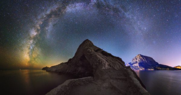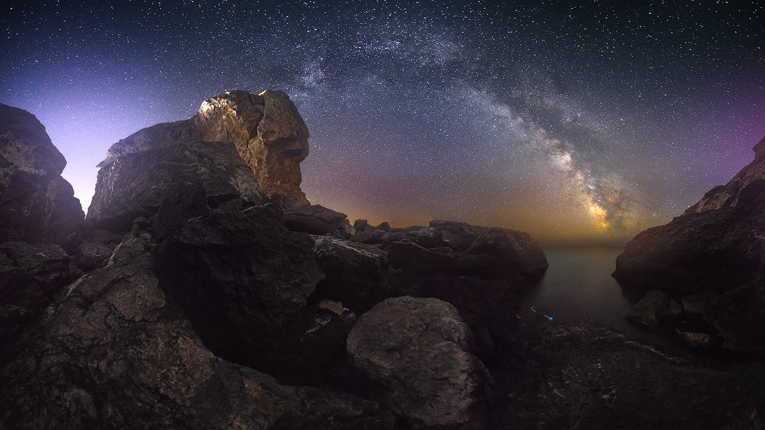 Все началось в августе 2014 года. Тогда я решил поехать в Крым, чтобы отдохнуть и пополнить альбом новыми фотографиями. Я был наслышан о красивых ландшафтах Нового Света, просмотрел множество работ других фотографов, и мне очень хотелось видеть эти места на своих снимках. Самым впечатляющим местом был грот Голицына – огромная пещера, скрывающаяся от туристов за выступом горы Коба-Кая. Я был поражен масштабами и красотой, открывшейся глазу. Решил, что непременно сниму это место ночью. На южной стороне Коба-Кая находился «небольшой пятачок», с которого можно было сделать отличную панораму. Но гора была в двух метрах от камеры, и несколькими кадрами нельзя было обойтись. Моя попытка сделать этот снимок так, как я его представил, в тот день не удалась. Причиной стало отсутствие большого опыта панорамной съемки, да и штатив не был приспособлен для этого. Самое обидное: ночью в августе центр галактики Млечный Путь уже скрывался за мысом Капчик. Уже тогда я понимал, что единственно возможный месяц для съемки задуманной композиции – июль. Подготовившись, я вернулся в Крым в июле 2015 года. Я дождался момента, когда галактика будет строго над головой, тогда и приступил к съемке сферической панорамы. Меня композиция очень порадовала и впечатлила, и я рад тому, что она впечатляет других.