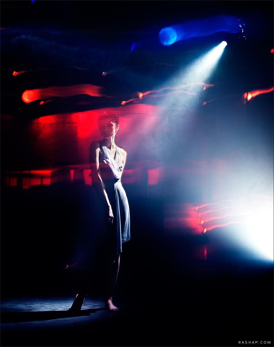 Этот приём называется техникой смешанного света. В нём одновременно используются импульсный и постоянный свет, благодаря чему можно работать на длительных выдержках и получать часть элементов статичными, а часть – динамичными.
