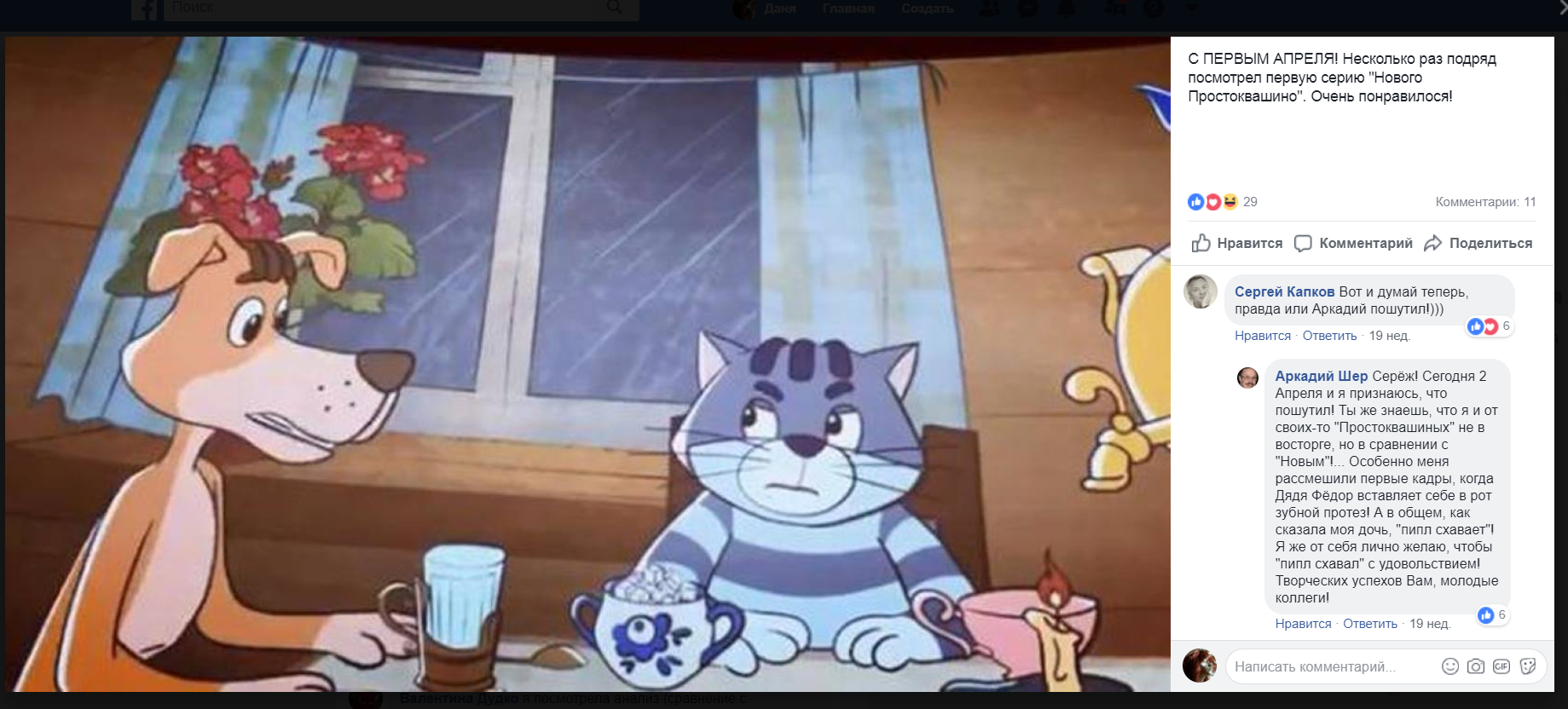 Это лишь малая часть его истории. Описать всё мне не хватит и нескольких статей. А продолжать можно бесконечно. Например, многие решили, что Печкина он срисовал с самого себя, а Маму – со своей супруги. И что Попов в итоге Шеру стал роднее и ближе, чем родной брат. Но это уже слишком много подробностей. Я думаю, мне удалось очертить ту говорящую простоту, которую не стоит нагружать мишурой из деталей. Я лишь хочу добавить один скрин с его странички Facebook, чтобы окончательно сформулировать очевидное. Вот, что написал Аркадий Шер о продолжении истории Простоквашино. И вот, что ему написали там в ответ.