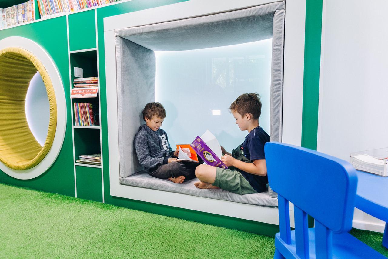 Это современное пространство, где можно проводить лекции, мастер-классы, где есть игровые комнаты для детей, всё для того, чтобы в окружении книг и культуры люди могли с удовольствием и пользой проводить время всей семьёй.